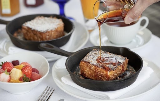 À gauche : Vue depuis le lobby au dernier étage. / À droite : French toast proposé en quantité limitée au petit-déjeuner, croustillant à l’extérieur et moelleux à cœur.