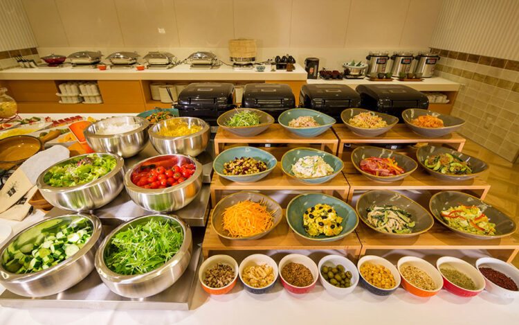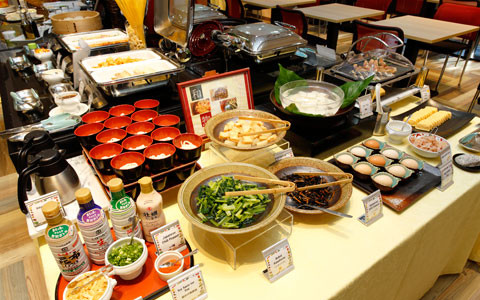 À gauche : Situé au cœur de Sannomiya, pratique pour le tourisme comme pour les déplacements professionnels. / À droite : Des légumes de saison à un vaste choix de desserts, un petit-déjeuner généreux et équilibré, offrant un moment qui dépasse l’ordinaire.