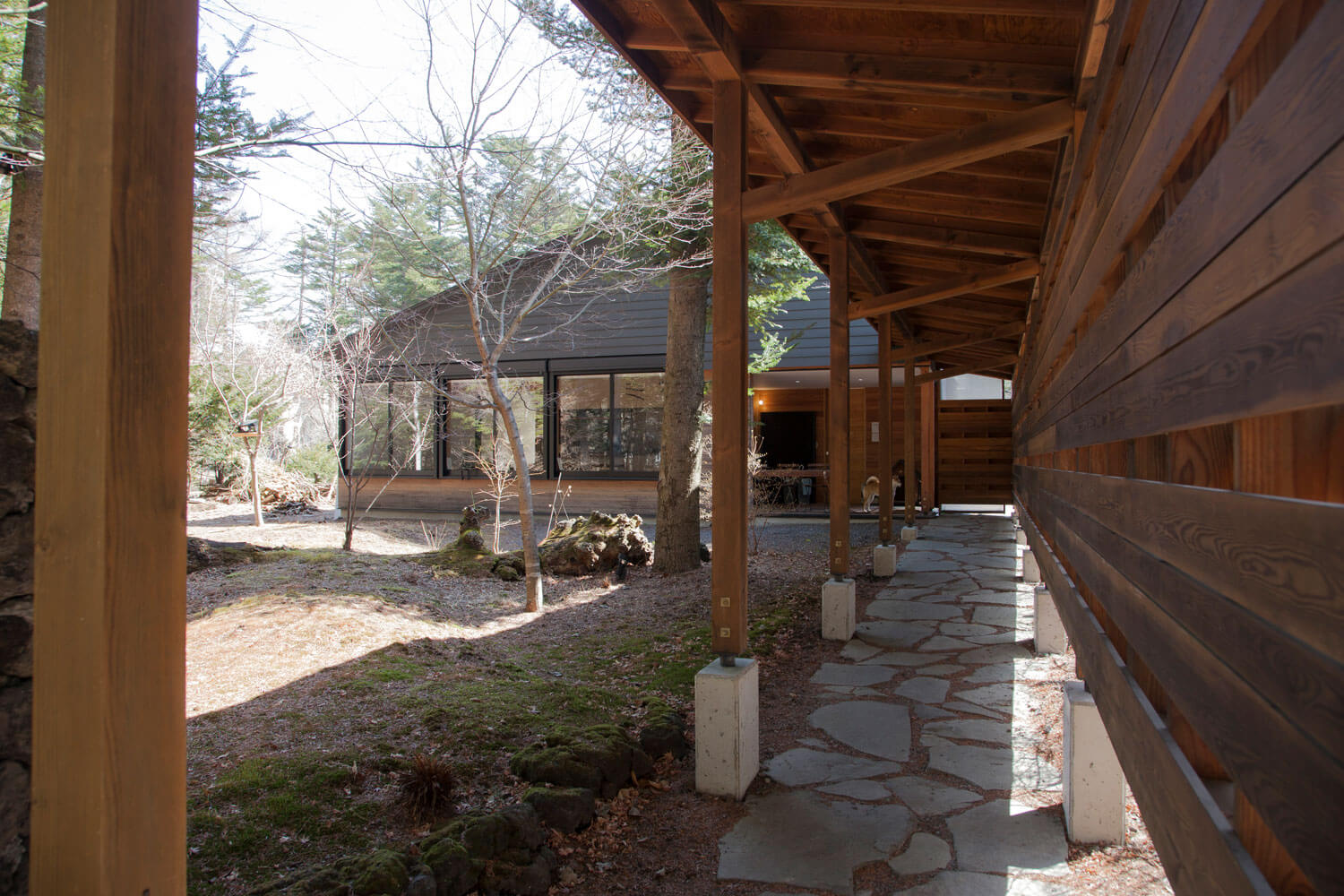 Naka-Karuizawa is located in the central part of Karuizawa Town. Its main street, a small thoroughfare lying parallel to Motorway No 146, is a quiet avenue that constitutes a green tunnel. It got its nickname of ‘Royal Prince Street’ as imperial family members used to travel along the road when they came here to escape the heat. The signboard for Ray Coffeehouse is modestly displayed in an area off the street that is surrounded by a small cluster of trees. Following the wooden wall as you make your approach, you reach a garden space with the café building appearing on the opposite side.