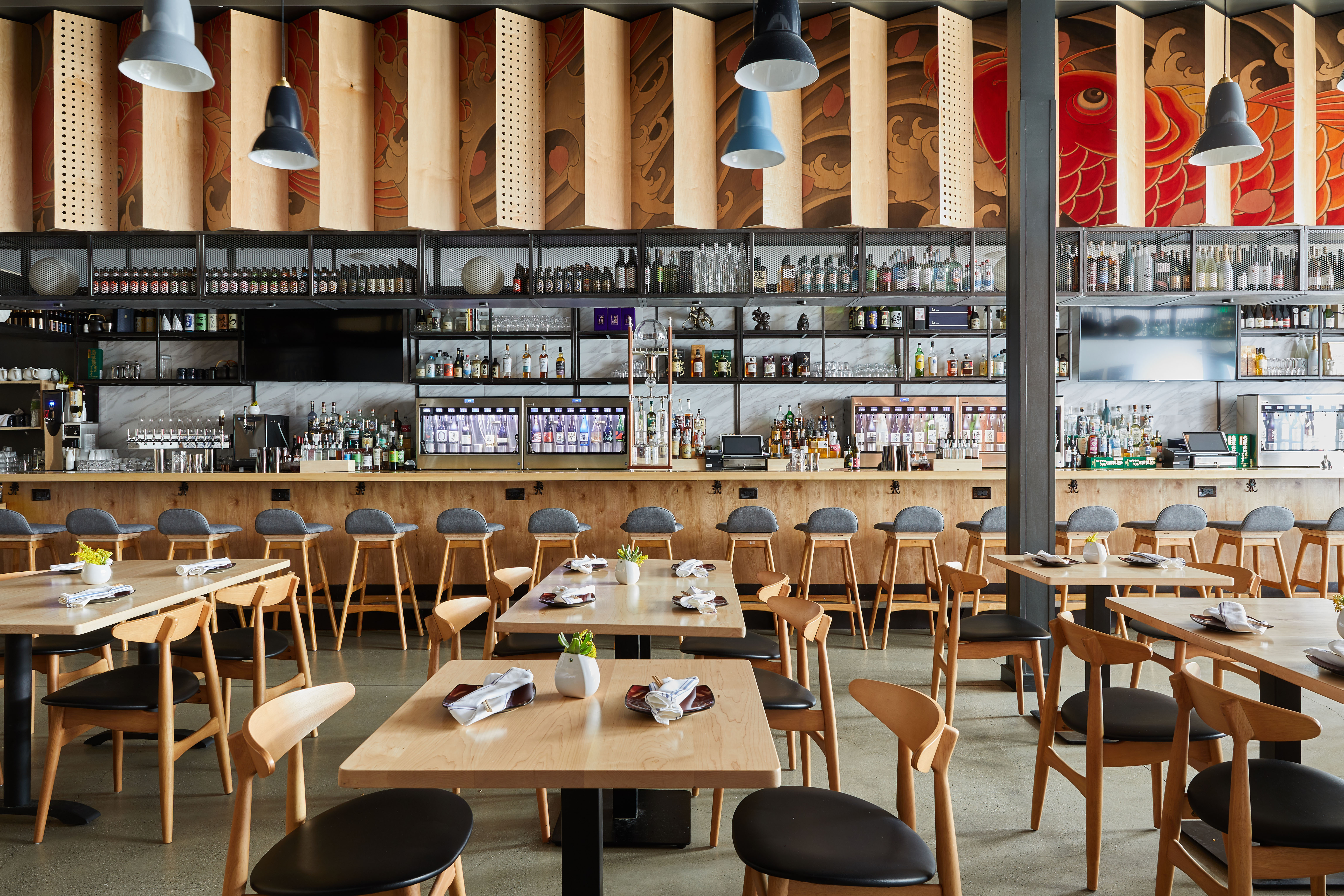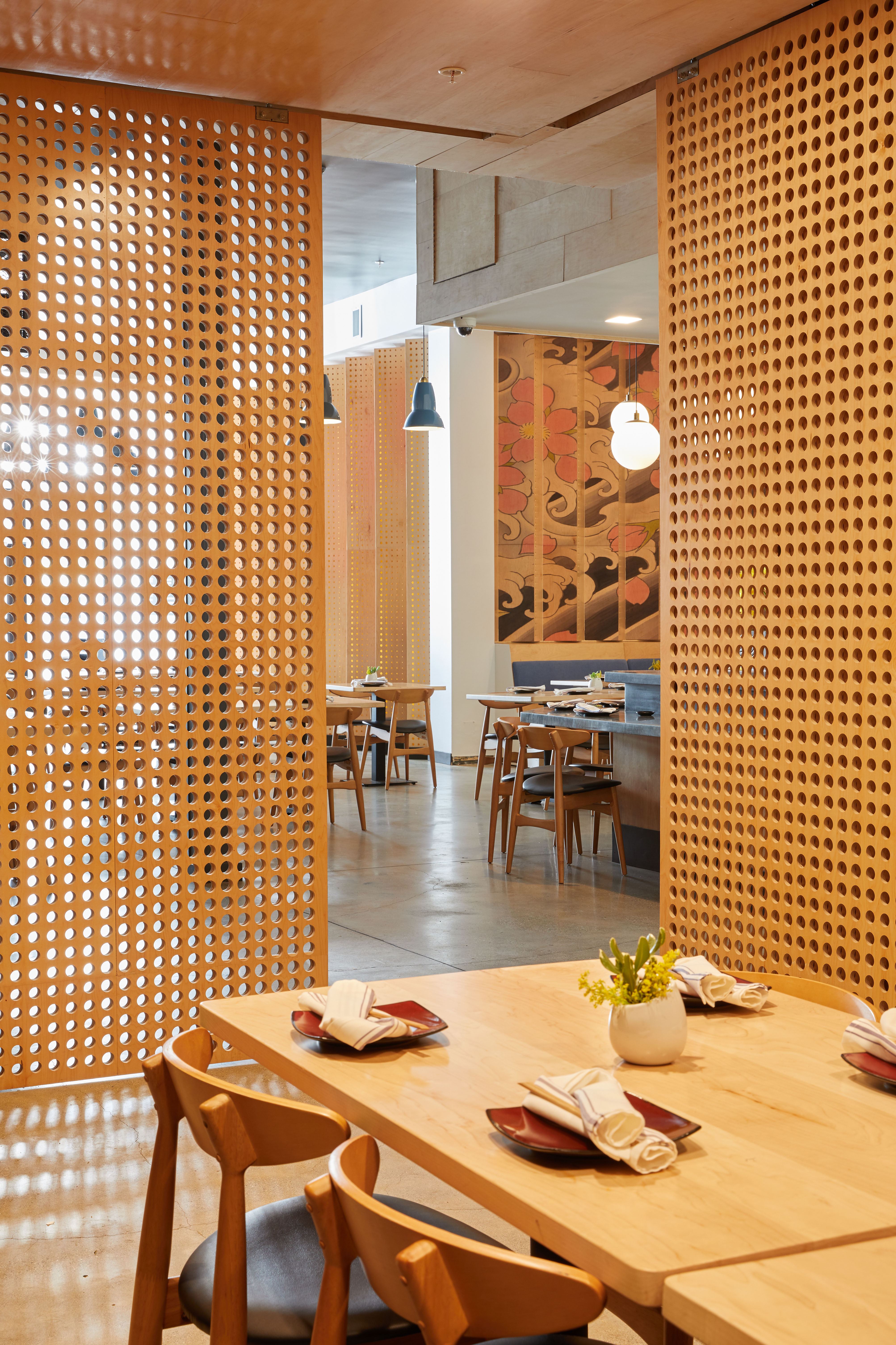 At Sake Dojo restaurant (also renowned for its excellent culinary offerings), whole sections of wall are decorated with aquatic-themed Japanese tattoo patterns. These perforated plywood panels let in the light and are also modular, making it possible to create private rooms by sliding them across like fusuma, traditional Japanese doors.