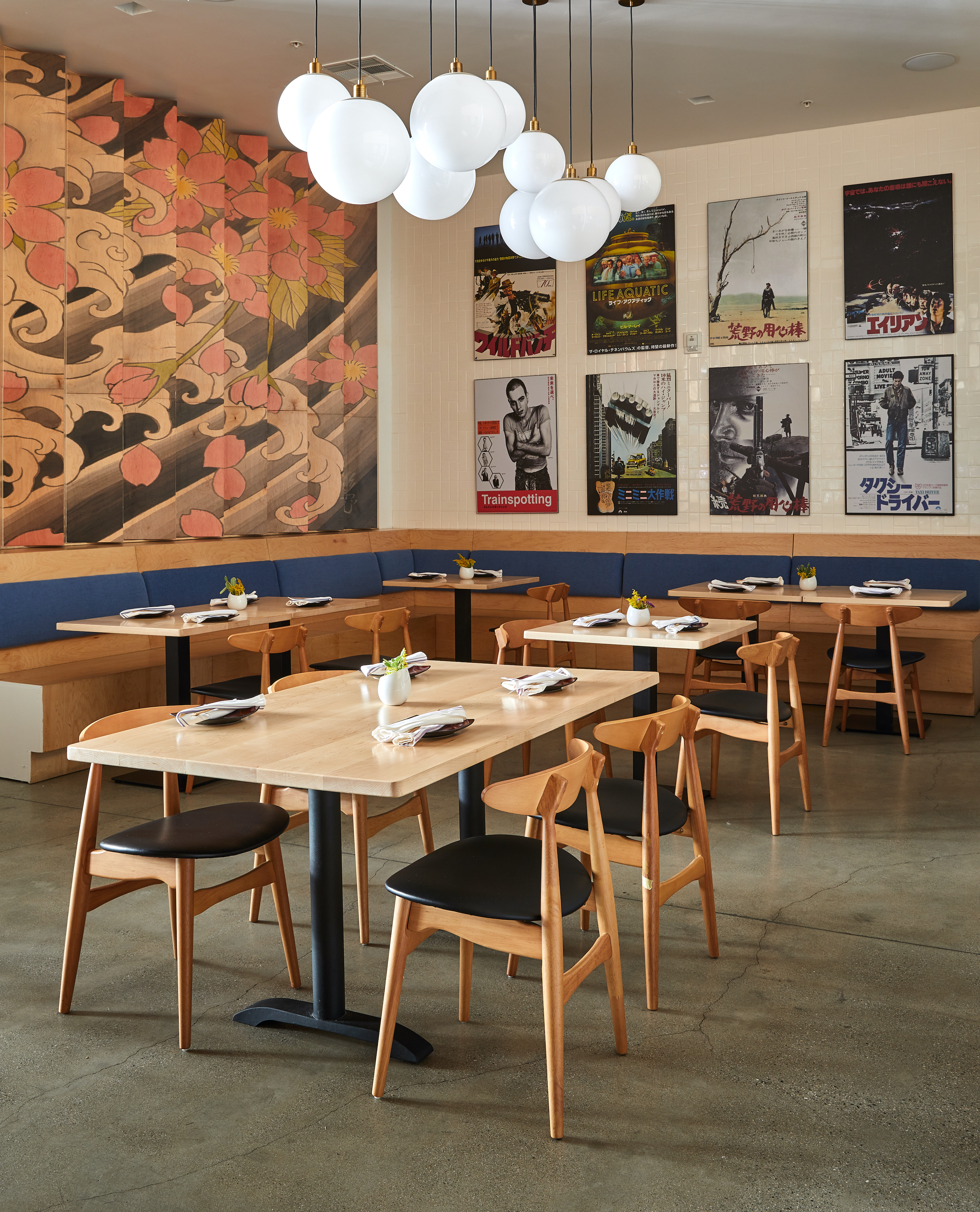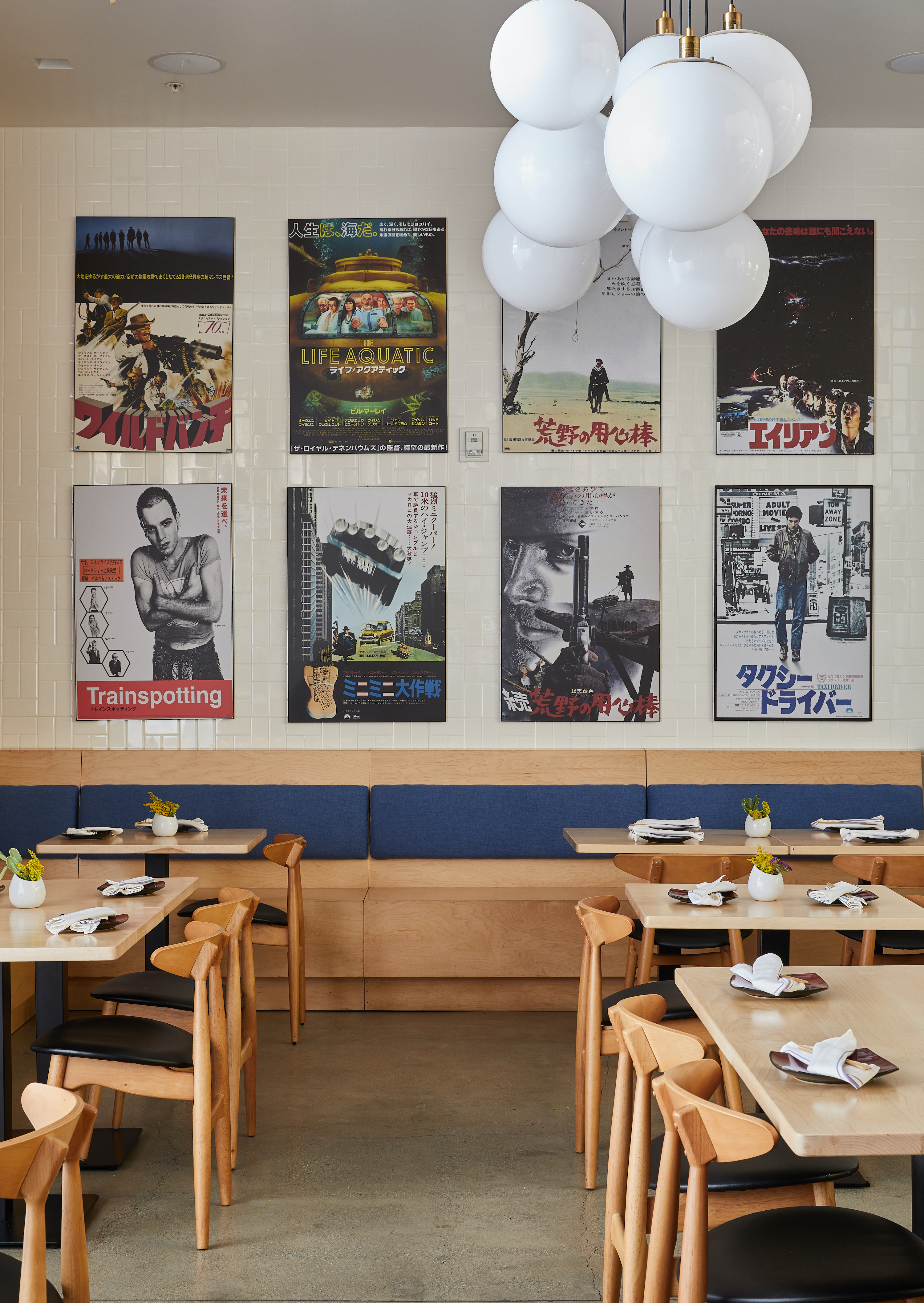 The architects prioritised a rich mix of styles and themes for the other decorative elements, which include American film posters translated into Japanese—such as Wes Anderson’s The Life Aquatic (2004), in a nod to the restaurant’s overall theme. The space also displays vintage cameras and Japanese cookery books.