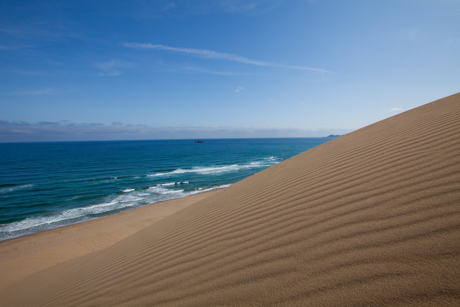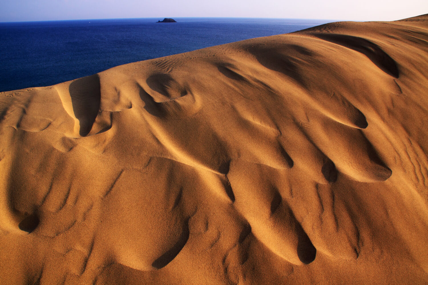 Formed over the course of 100,000 years by strong coastal winds and the constant movement of the tides, the Tottori Sand Dunes stretch 16 kilometres from east to west and 2 kilometres from north to south and, at their tallest, reach a height of 47 metres, bordering the Sea of Japan in the eponymous Tottori Prefecture.