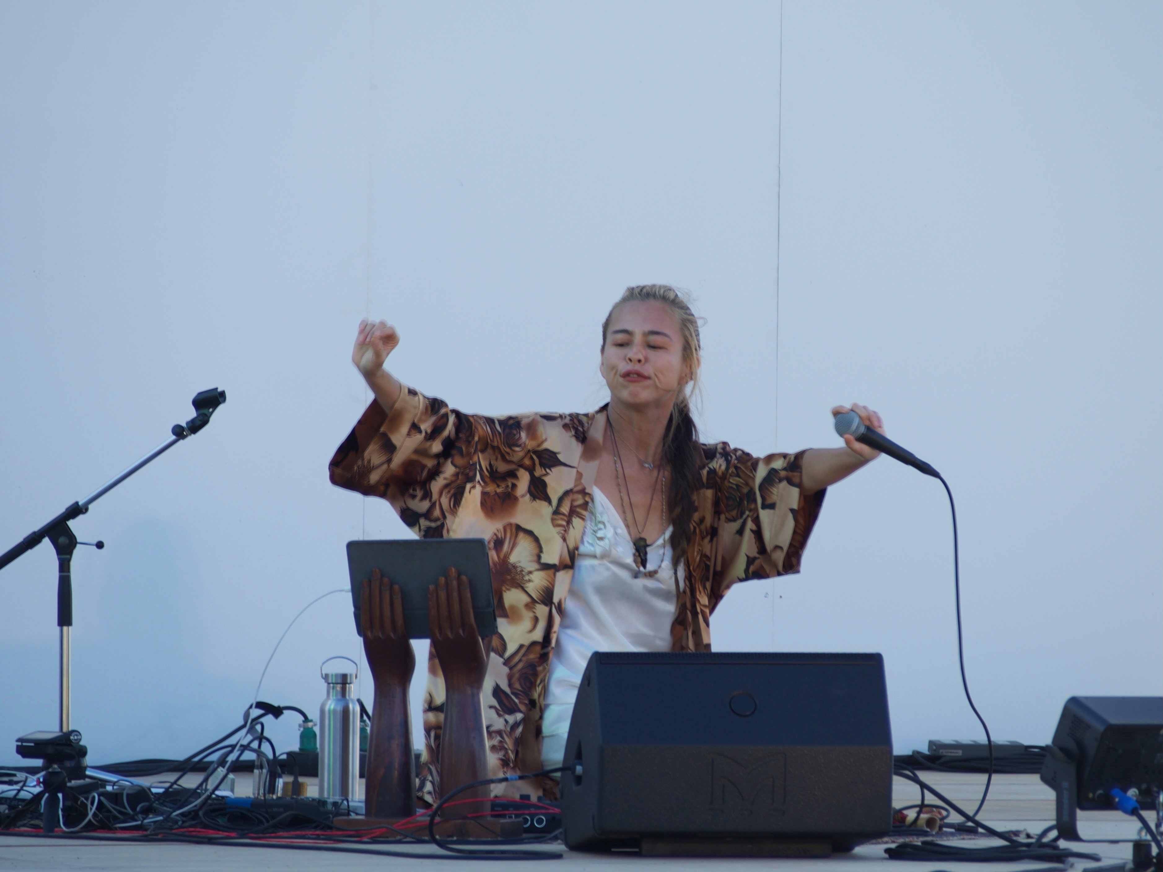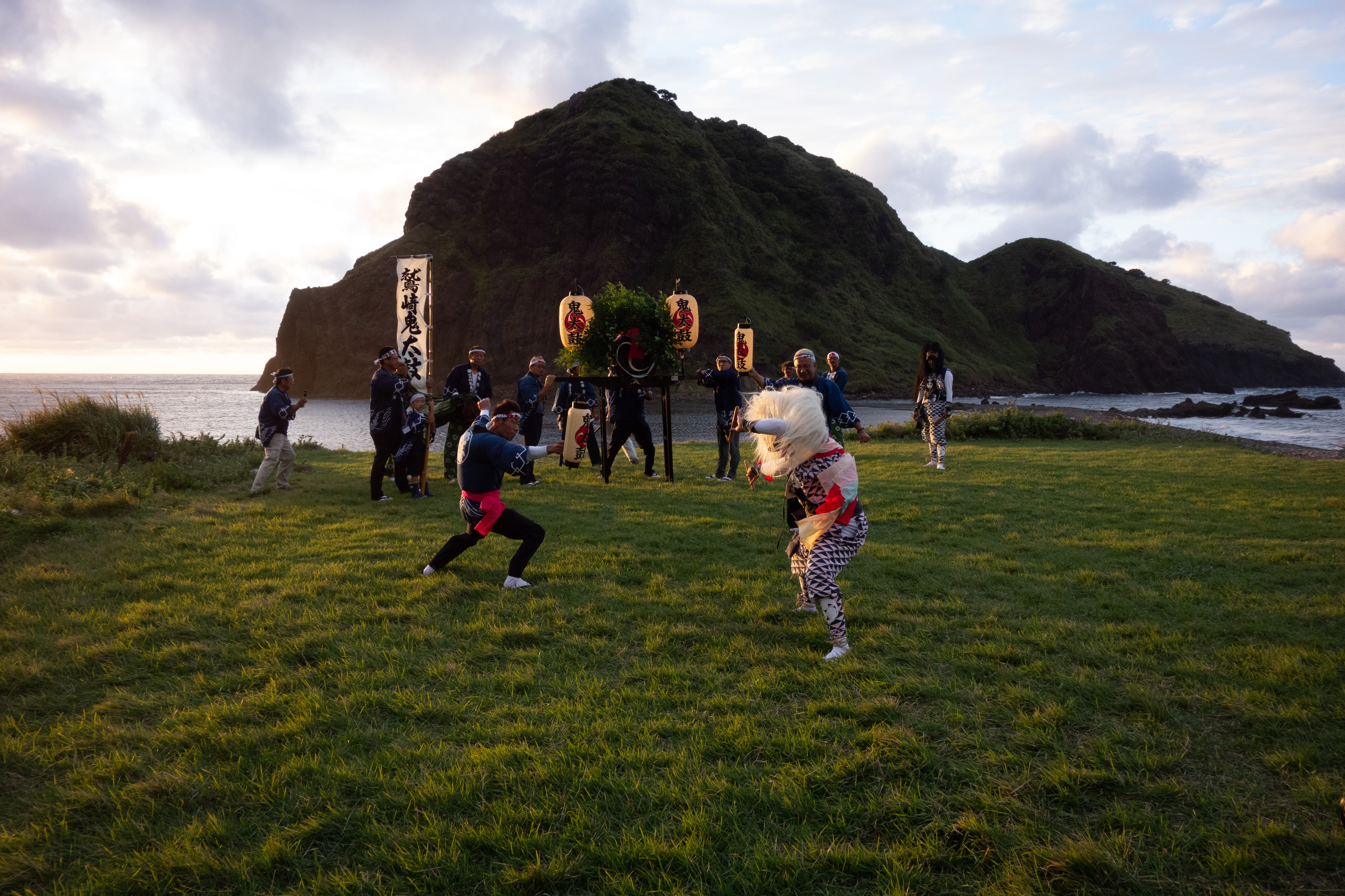 On a hilltop overlooking the pair of rocks floating in the sea known as Futatsugame, the morning of the second day began gently with DJ MOODMAN’s ‘Ohayo Dommune’ as Sado folk songs gently echoed in the background. The main event opened with a prayer by Shoin Kajii, a photographer and a Buddhist monk, and this was followed by a performance by solo solo solo. The overtones of the Mukkuri, a bamboo instrument handed down from the Ainu people, resonated with the sounds of nature.