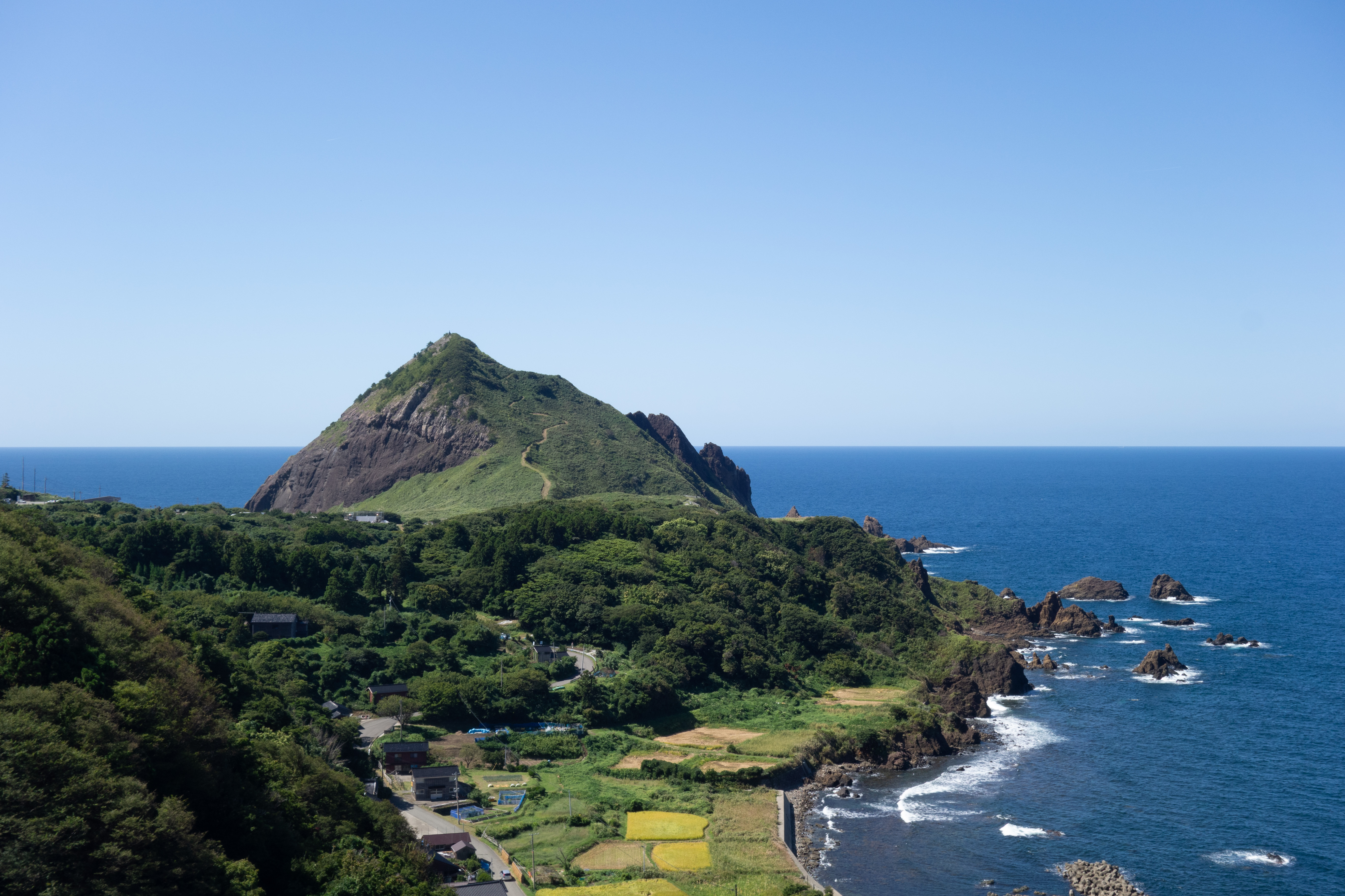 ‘Oni-Daiko’ is a traditional performing art on Sado. In the background is Futatsugame, so named because it looks like two turtles, side by side. The clarity of the seawater, which is Sado Island’s best, has led it to its selection as one of the ‘100 Best Bathing Beaches in Japan.’