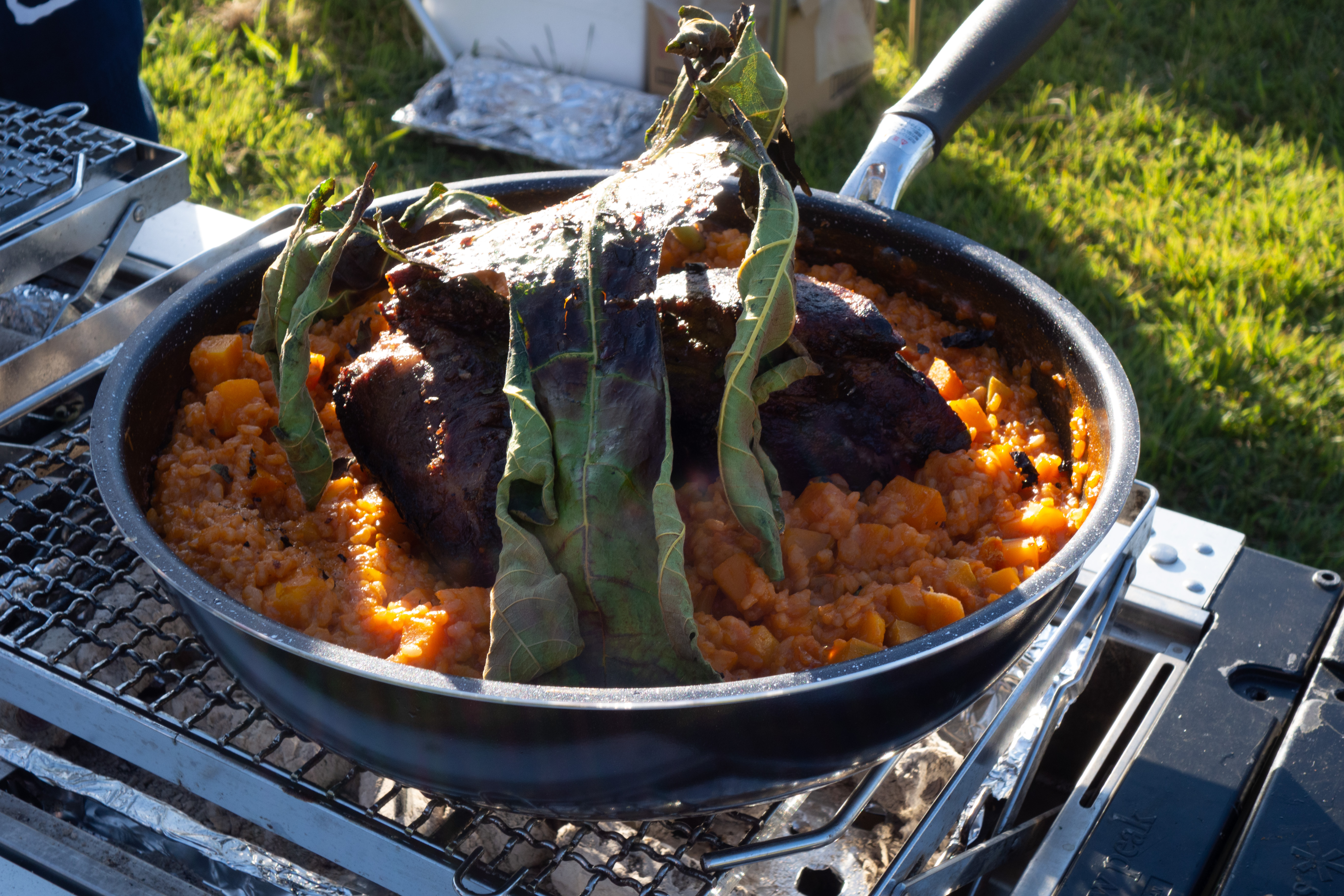 Surrounded by the artworks of HAMADARAKA, DENSE, essu, Hiroki Imai, and Shunoven, and finished off with a rousing performance of Oni-daiko drums, was ‘Oni-meshi’, a modern arrangement of the traditional Sado food, ‘Imiso.’