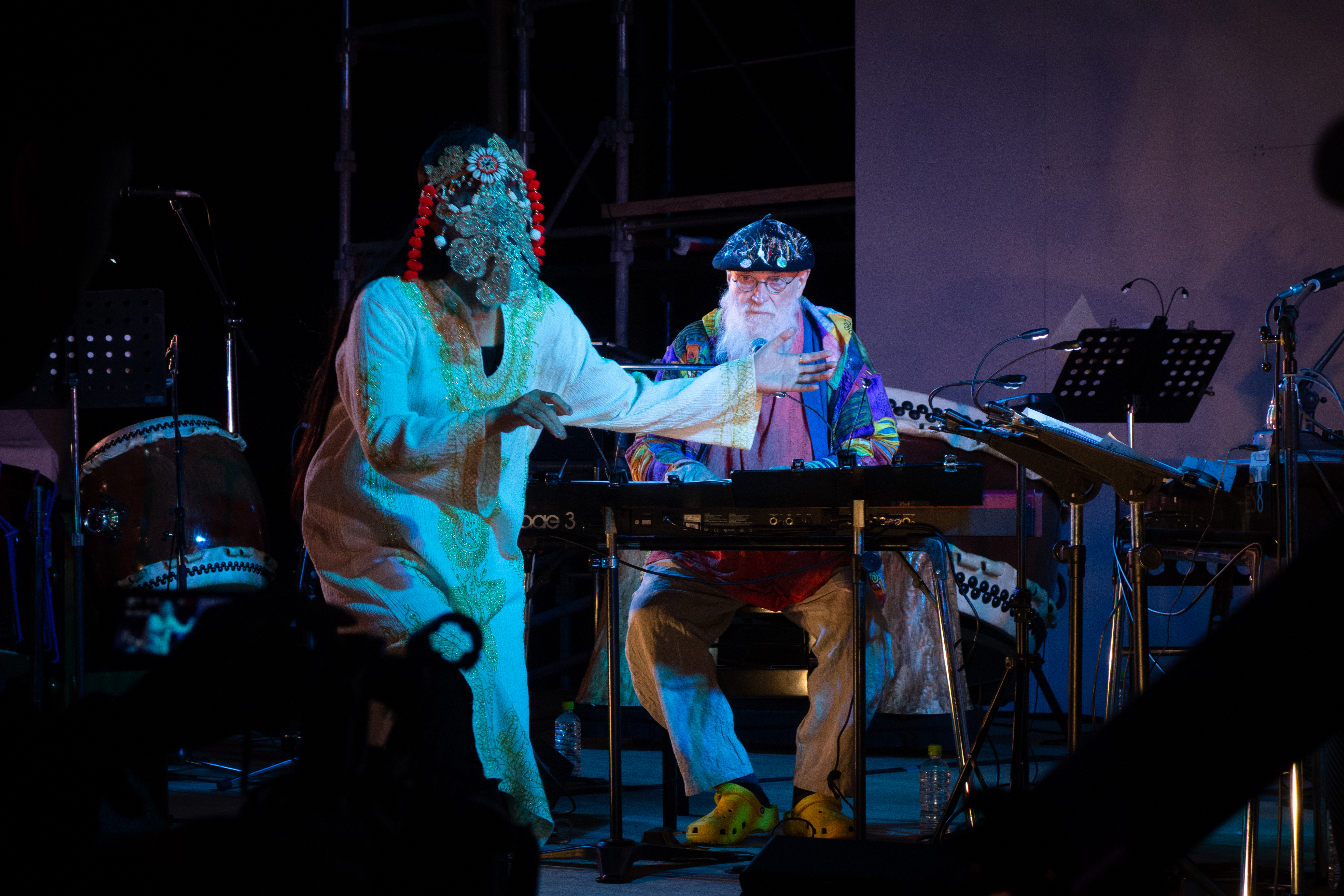 The action then moved to the main stage of Onogame, where the live performances continued. Manami Kakudo appeared with tuba player Gideon Juckes. Under the blue sky, her free-spirited and soft voice resonated pleasantly, and OLAibi brought the audience to their feet with a tribal sound that made them truly experience the joy of music. Then the full moon rose, bathed in the piercing sounds of Keiji Haino. With the live performance of ‘WAKARIMASEN’ by Terry Riley—as part of the ‘DOMMUNE Presents “LAND MUZAK” SADO Project’, formed for the purpose of this art festival—the audience floated in a euphoric atmosphere fused with traditional performance arts.