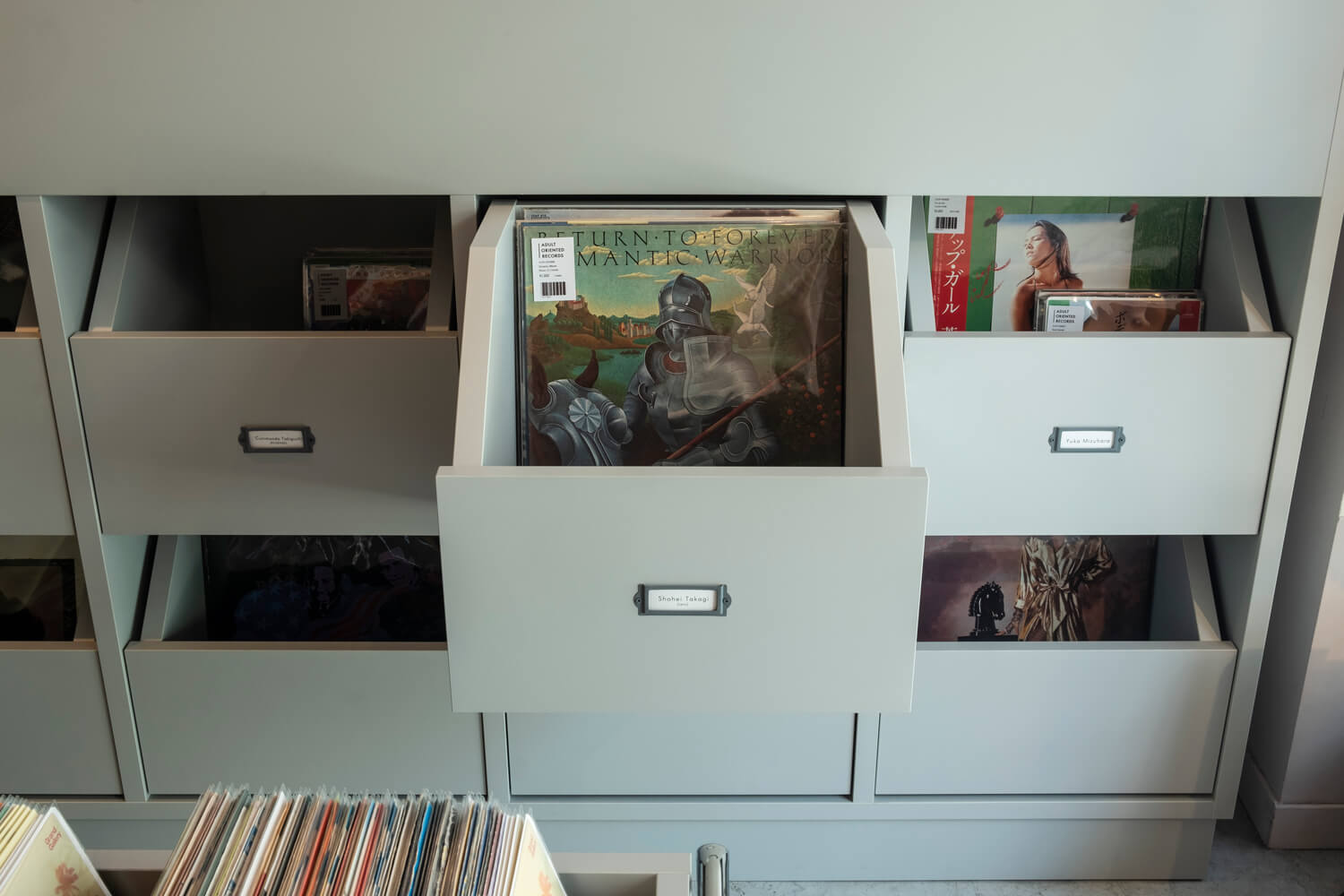 The pop décor is inviting, but drawer after drawer full of recordings specially selected by celebrities is what really catches the eye. The selectors, called ‘music providers’, include FPM (‘Fantastic Plastic Machine’) Tomoyuki Tanaka, the model and DJ Yuka Mizuhara, Shohei Takagi of indie band Cero, and Ken’ichi Aono of Beams Records, each one a rising star in his own right.