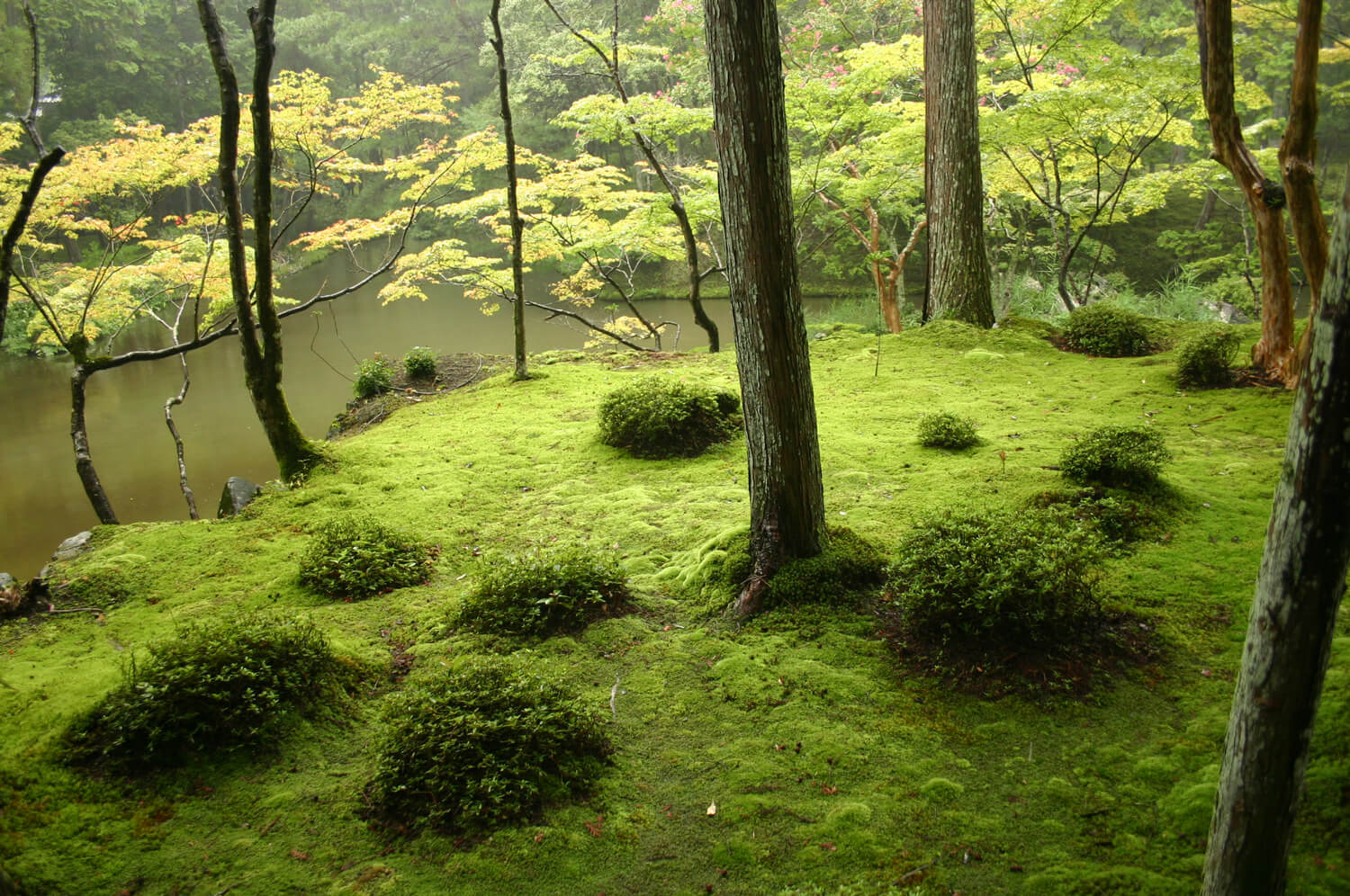 Wandering among the lichen-covered trees and moss-covered flower beds of the Saiho-ji Temple is somehow reminiscent of being in a Miyazaki film. With a feeling of timelessness, nature orchestrates a sublime display of chiaroscuro, with the sun’s rays subtly illuminating the fluffy moss between the dense foliage of maples and bamboos.