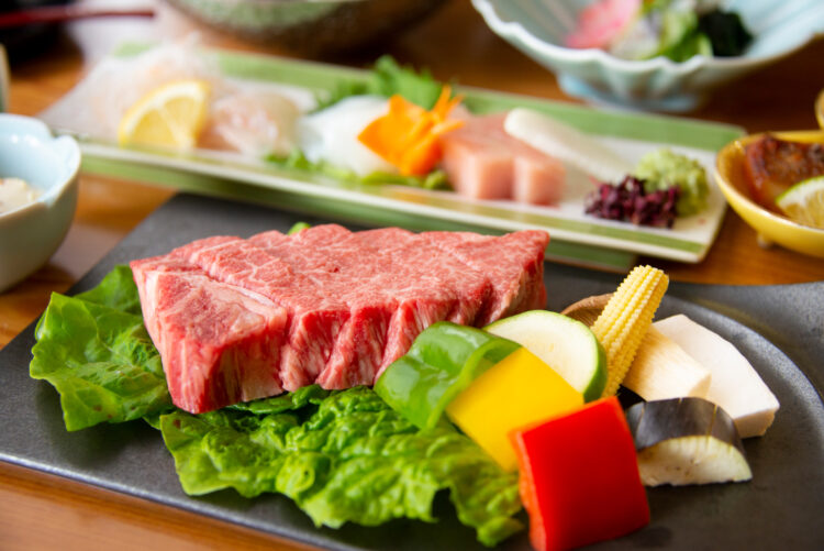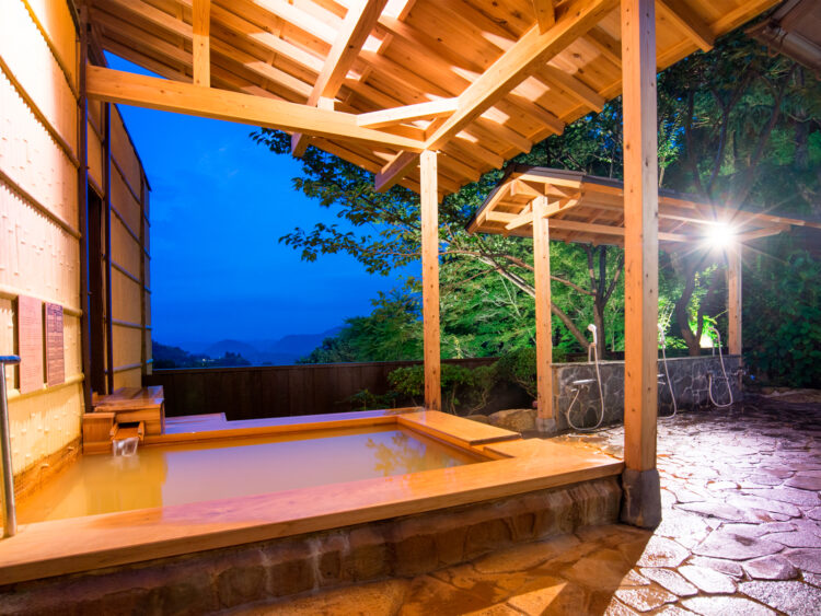 Left: A ‘kaiseki’ dinner centered on Kobe beef steak, showcasing seasonal ingredients and deep, aromatic flavors. / Right: The open-air Kinsen bath sourced directly from the property. Its iron and salt content gives the water its characteristic golden hue.