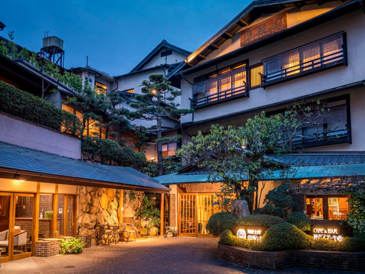Left: Interiors that reflect the aesthetic of Hanshinkan modernism and the subtle play of light associated with Jun’ichirō Tanizaki. / Right: The exterior, registered as a Tangible Cultural Property, stands in the heart of town, convenient for exploring Arima.