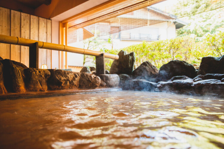 Rich in iron and salt, Kinsen turns a deep reddish brown as its minerals oxidize on contact with air. Its concentration is even higher than that of seawater, and soaking in it allows subterranean heat to seep gradually into the body’s core.