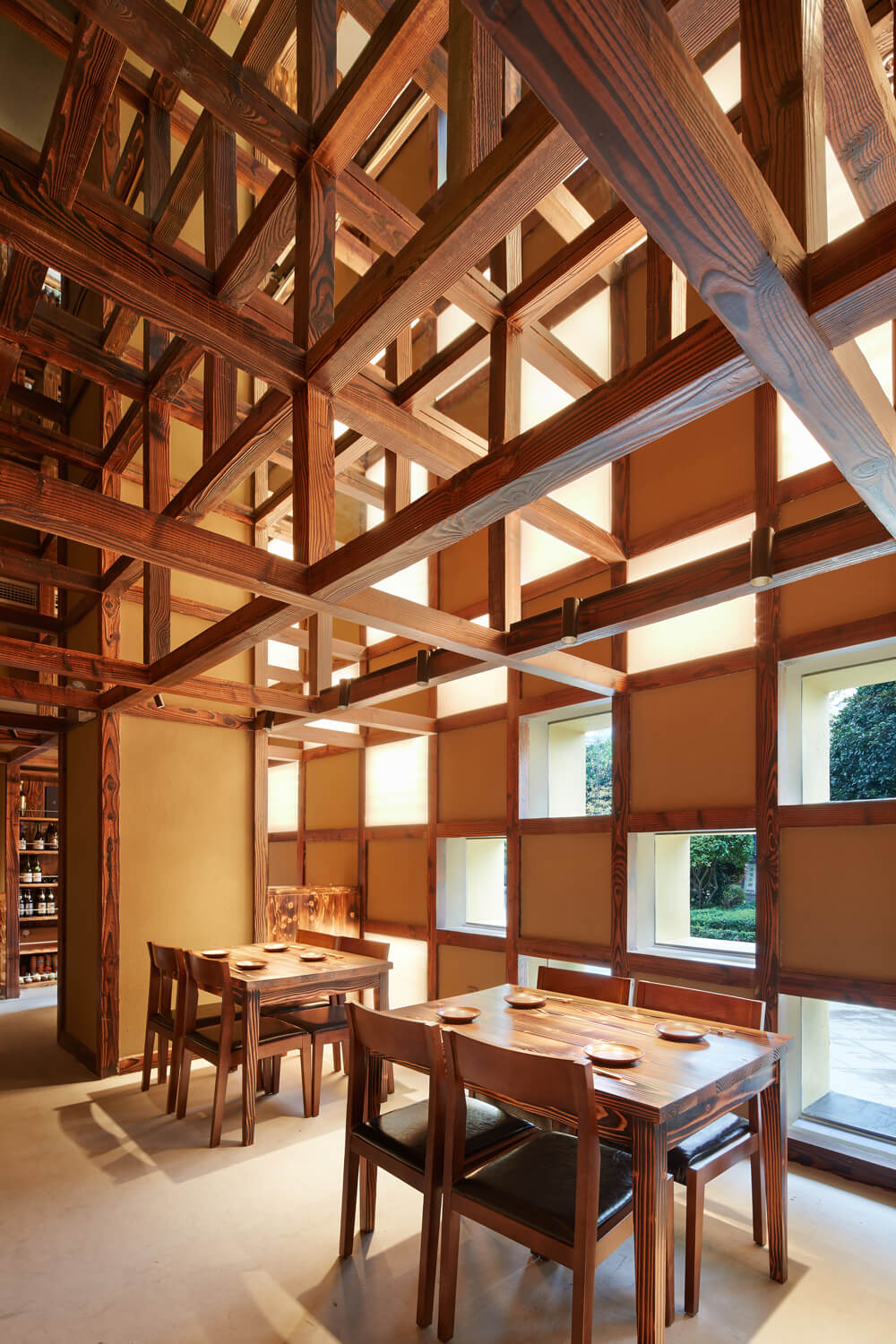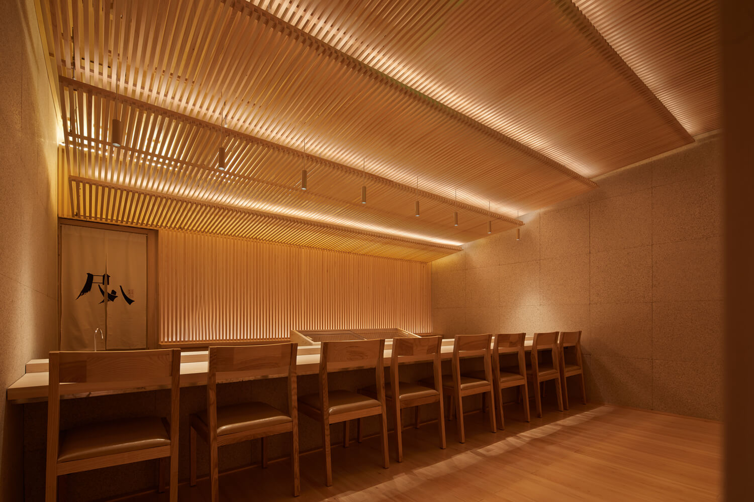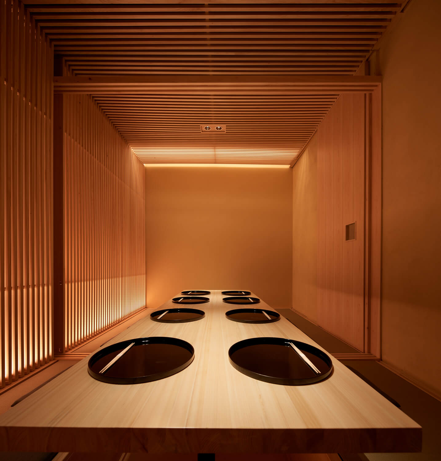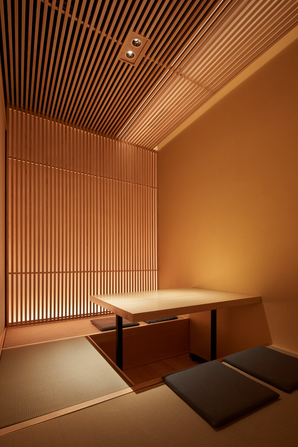 The second, smaller restaurant specialises in kaiseki, a gastronomic practice that consists of combining small portions of different dishes, each carefully prepared. To differentiate it from the rest of the space on this floor, the architect chose to decorate the ceiling with fine wooden panels, typical of tea tasting spaces across Japan. Superimposed, they create a slightly shimmering effect that contrasts with the heavy beams in the first restaurant.