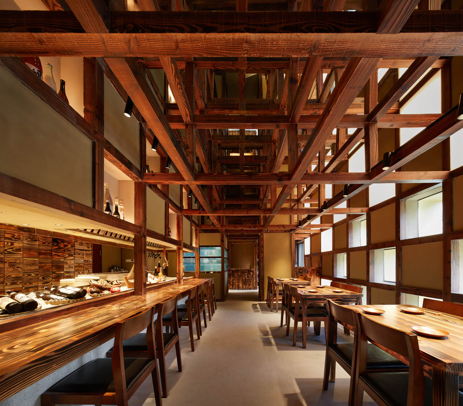 The first restaurant is centred around robatayaki, a grilling technique widely used in Japan. The space showcases the ceiling beams, directly inspired by the famous Yoshijima House in Gifu Prefecture. This traditional house, built in 1907 by wealthy sake merchants from Kanazawa City, is the first to officially be considered a site of Japanese cultural heritage or an Important Cultural Property.