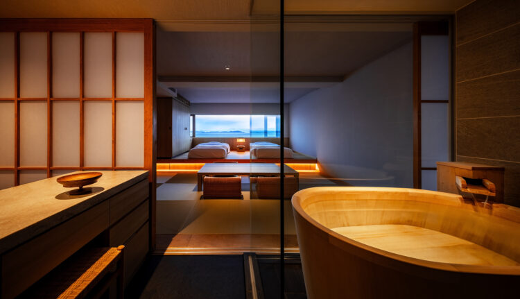 Left: Located within Awaji Yumebutai, the complex designed by architect Tadao Ando, the hotel’s modern architecture harmonises with the surrounding sea and greenery. / Right: Guest rooms designed to maximise natural light and openness, offering a calm and comfortable retreat.