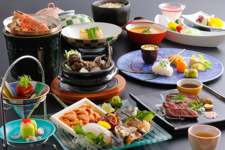Left: Guest room with a private ‘onsen’ bath on the special floor ‘Nami no Oto.’ Wide views of the Kitan Strait can be enjoyed from the window. / Right: The hotel’s signature creative ‘kaiseki’ course, ‘Subaru’. Seasonal flavors are presented together with carefully selected tableware and setting.