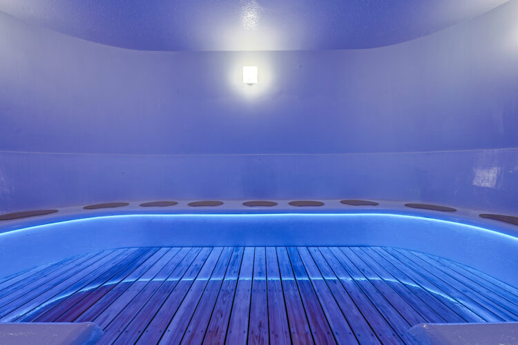 Left: Spa facilities include a mist sauna and other bathing amenities. The women’s large communal bath is shown here. / Right: Exterior view of the hotel. Museums and cultural sites are located nearby.