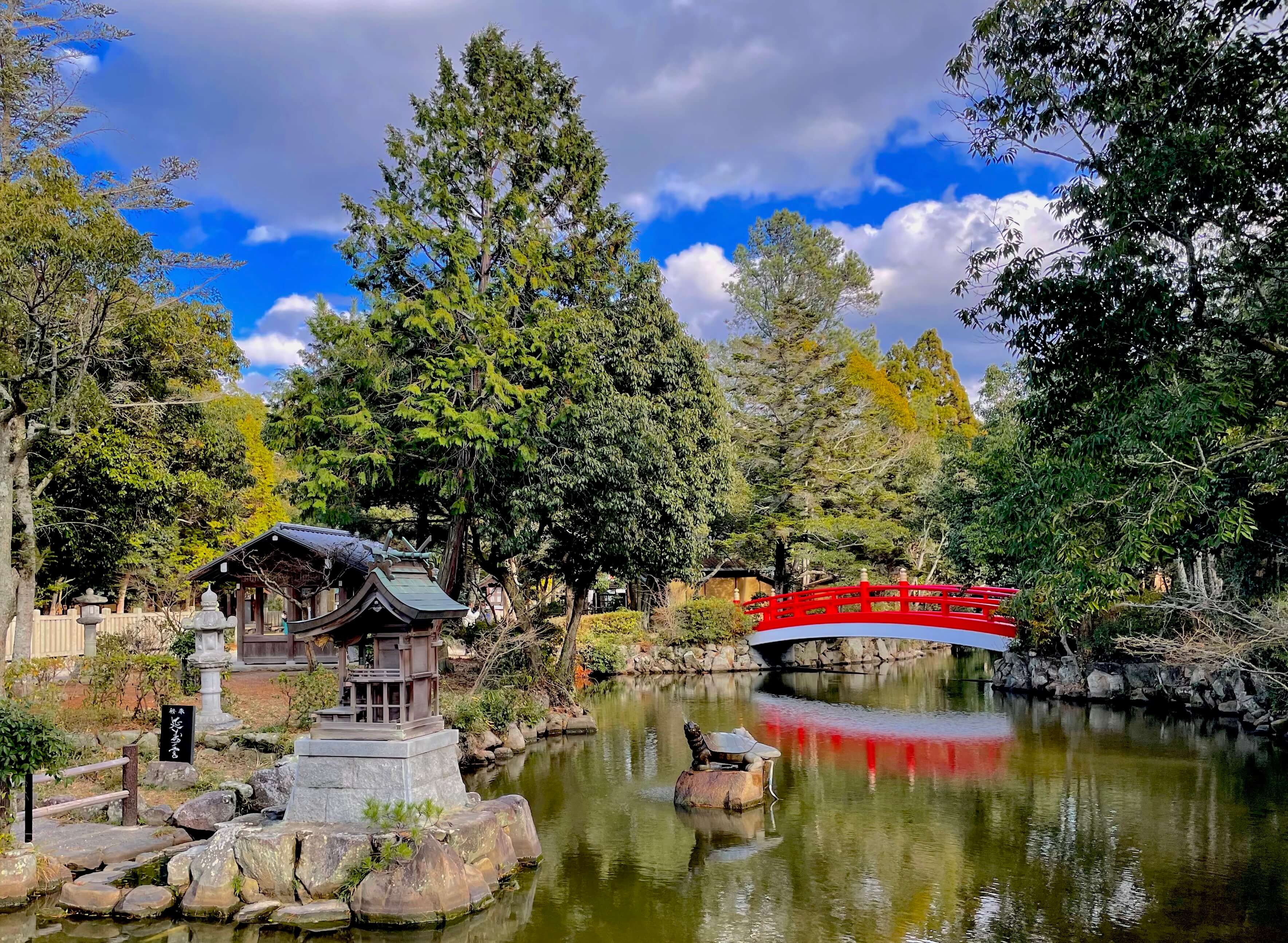 Encircled by the ancient Mihara Creek, it’s also a popular destination for couples. The sekirei ishi (‘wagtail rock’) within the shrine is named for the two ropes, one red and one white, attached to it, resembling the wagtail’s tail feathers. A sign by the rock explains that to seek a new partner, you hold the white rope first, then the red; to strengthen a current relationship, you reverse the order; and if visiting with your partner, the man holds the red rope, the woman holds the white, and you pray together holding hands.