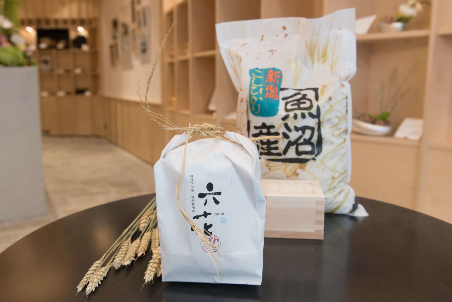 The region of Niigata is the number one rice producer in the country, the reason for which the store is focusing on items created from the grain from saké to mochis and other luxury items. There are also a number of products made by local artisans including knives from the town of Tsubame-Sanjo, small boxes sculpted from precious wood or kitchen utensils.