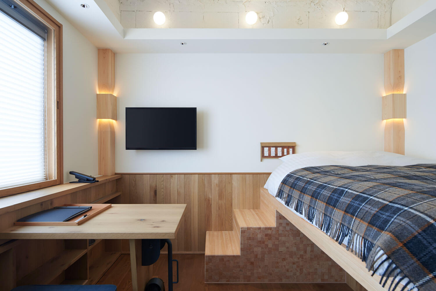 For its reopening, the architects decided to reinterpret the spirit of the hotel, originally built in 1969. Its 20 rooms were redesigned in different but complementary styles, transitioning smoothly from a room with tatami beds to more contemporary, classic décor. But the highlight at Claska is the rooftop, which offers a stunning view over Tokyo. Open-air cinema events are held there in the summer.