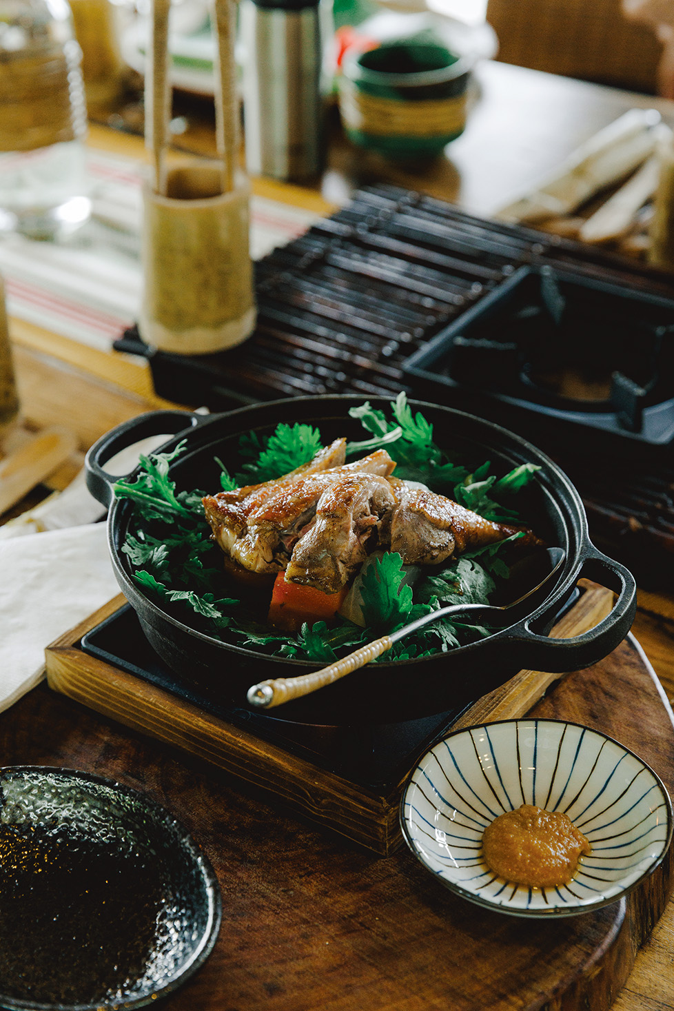 In addition to the goat stew, the main course may feature grilled bamboo partridge—a wild quail native to Taiwan—served with freshly picked vegetables.