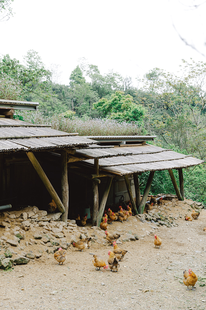 Free-range chickens. After being used for shiitake cultivation, the logs are crushed and spread across the coop, where they mix with poultry droppings to create natural fertilizer—a deeply sustainable Atayal practice.