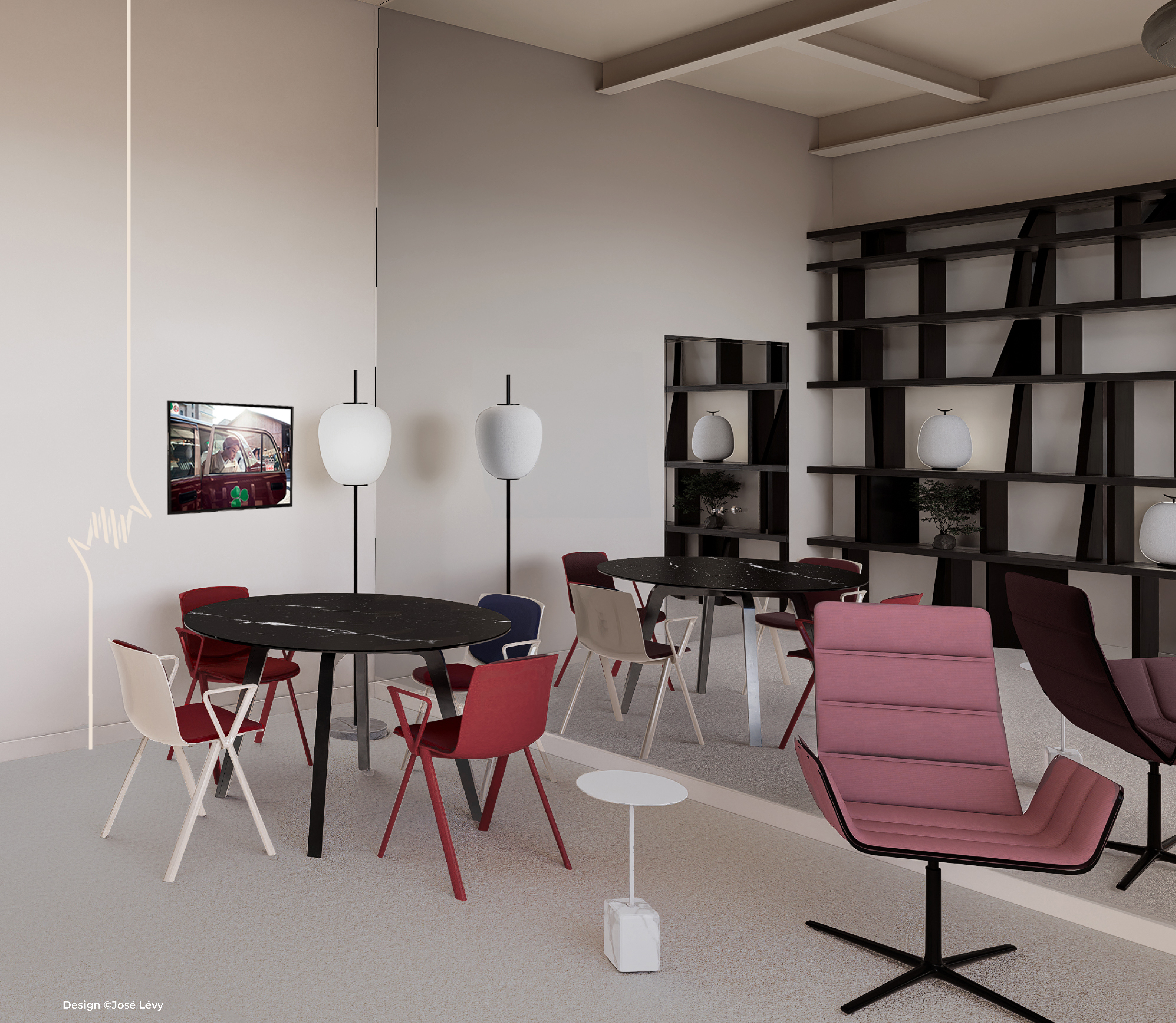 Projection of the French Pavilion’s protocol lounge, designed by José Lévy. On the left, his ‘Moving Tatami’ bench sits alongside Pierre Paulin’s ’Andy’ chairs on the right.
