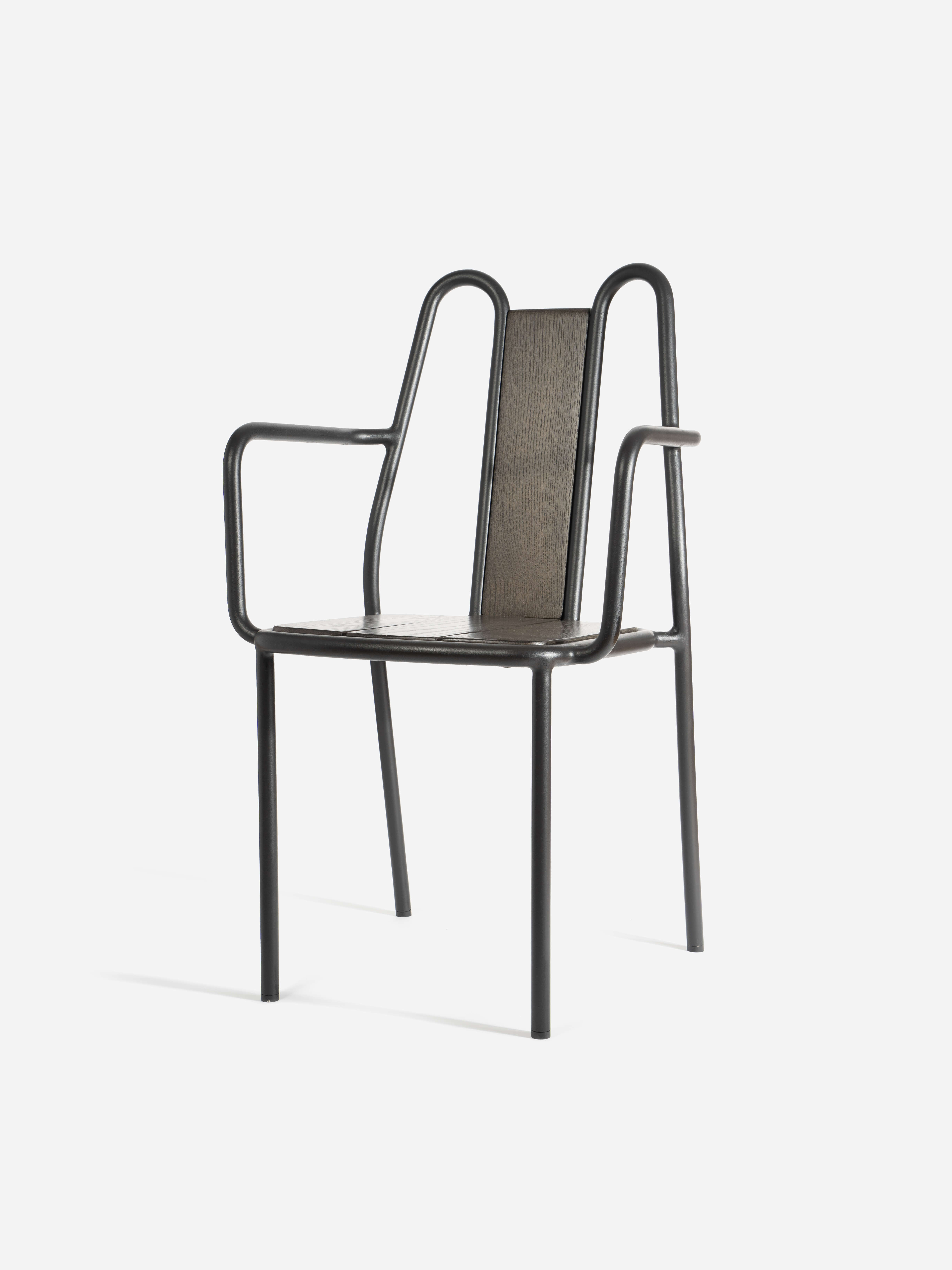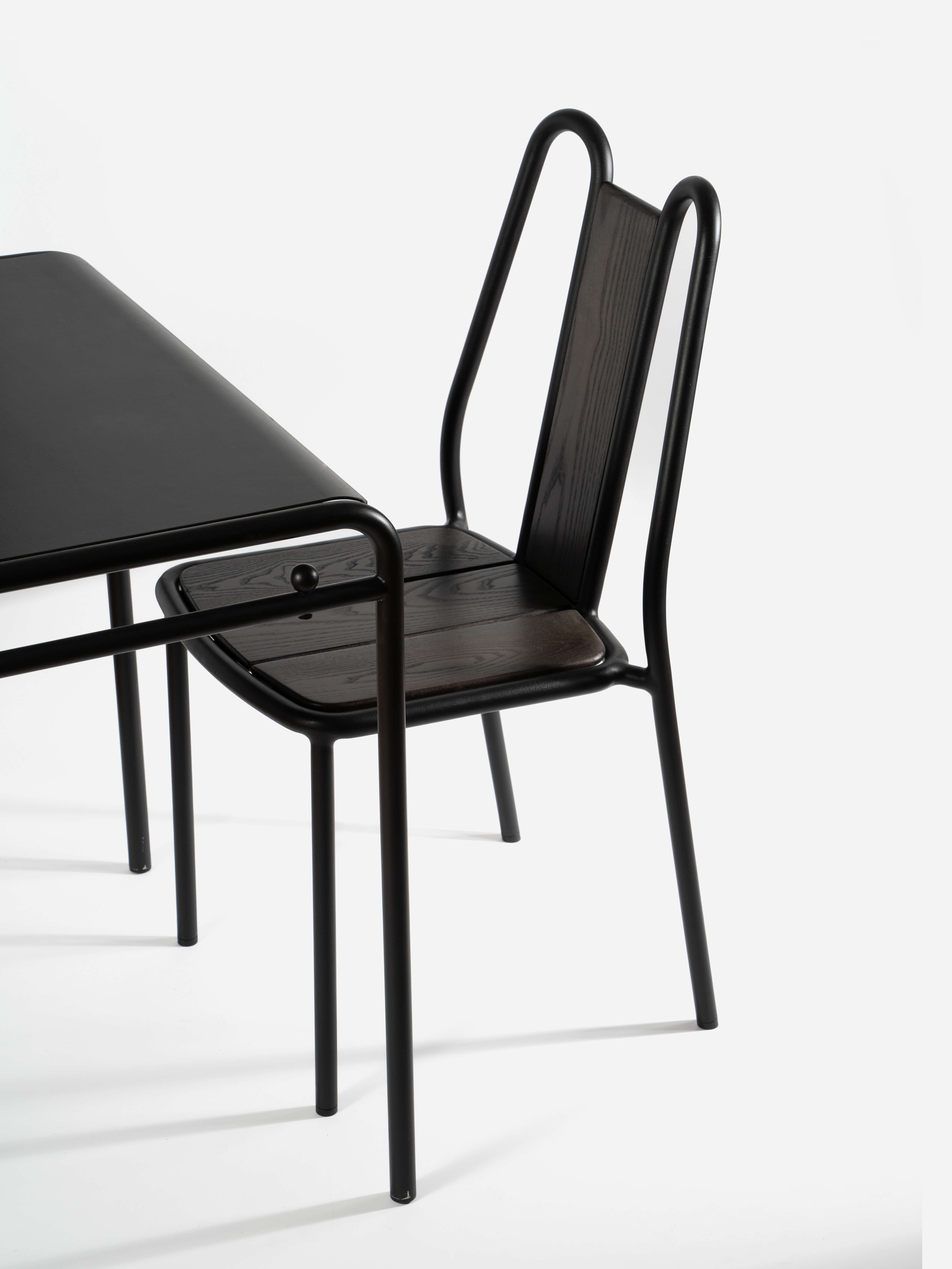 The ‘Osaka 25’ chair and table, designed by Jean-Baptiste Fastrez for Tectona, featuring metal tubing and wood. © Nathan Cussol