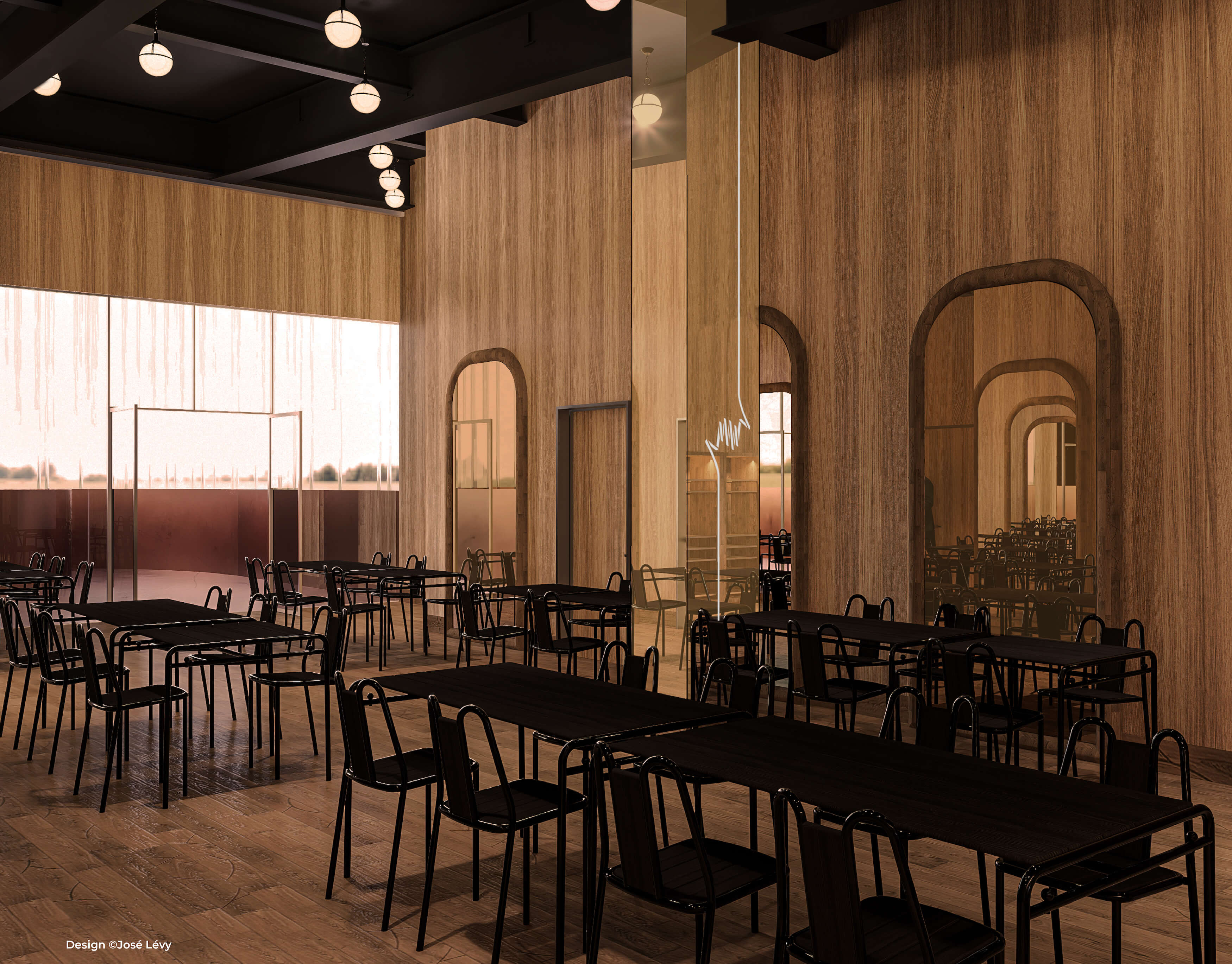 Projection of the ‘Bistrot,’ the dining area of the French Pavilion at World Expo 2025 Osaka, designed by José Lévy. The ‘Osaka 25’ chairs and tables by Jean-Baptiste Fastrez take center stage.