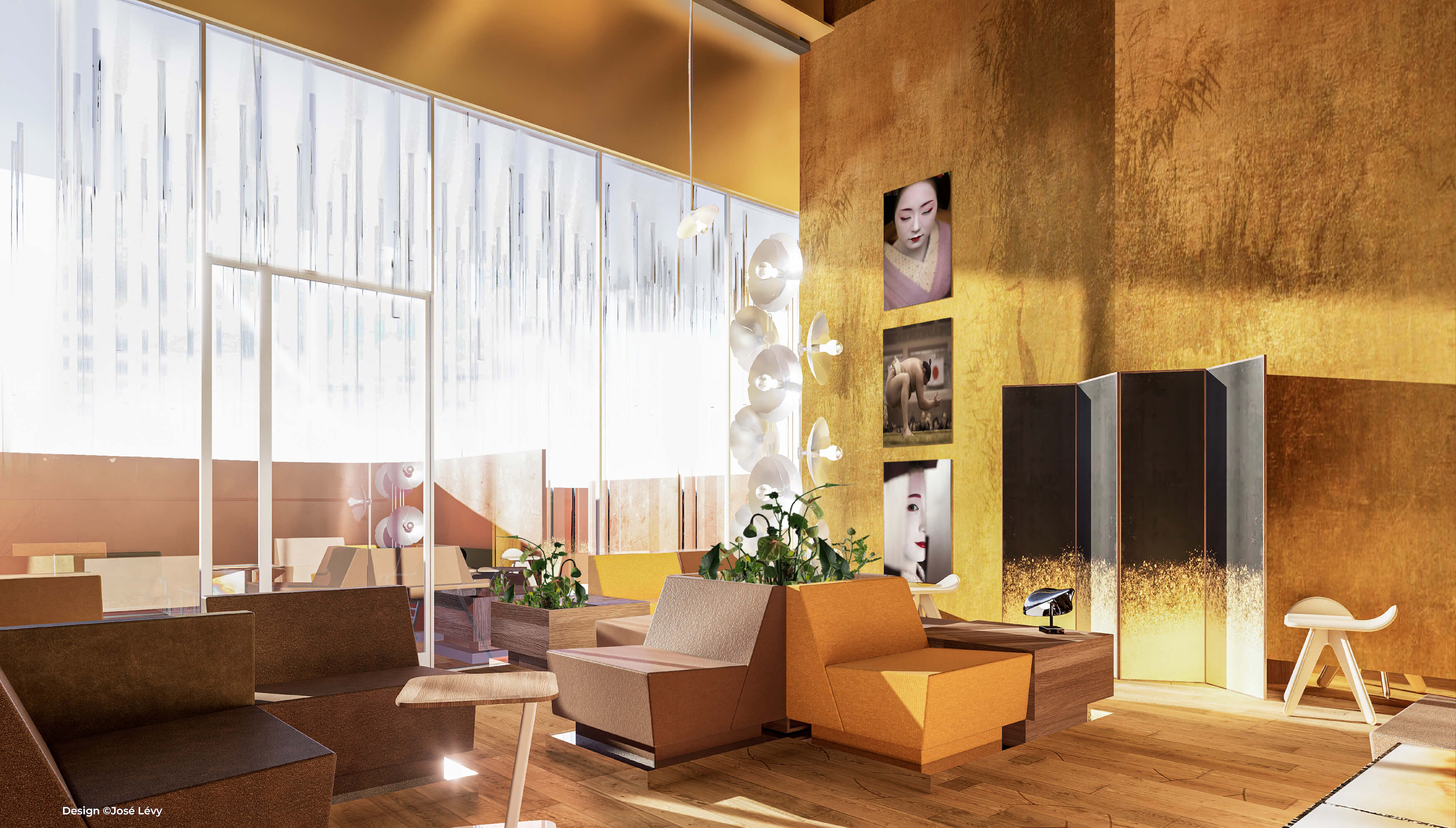 Projection of the Partners’ Lounge in the French Pavilion, designed by José Lévy. At the center, seating by Joseph-André Motte, specially produced for the occasion. On the right, a folding screen by design duo Garnier & Linker, crafted with gold leaf in collaboration with Kouseido.