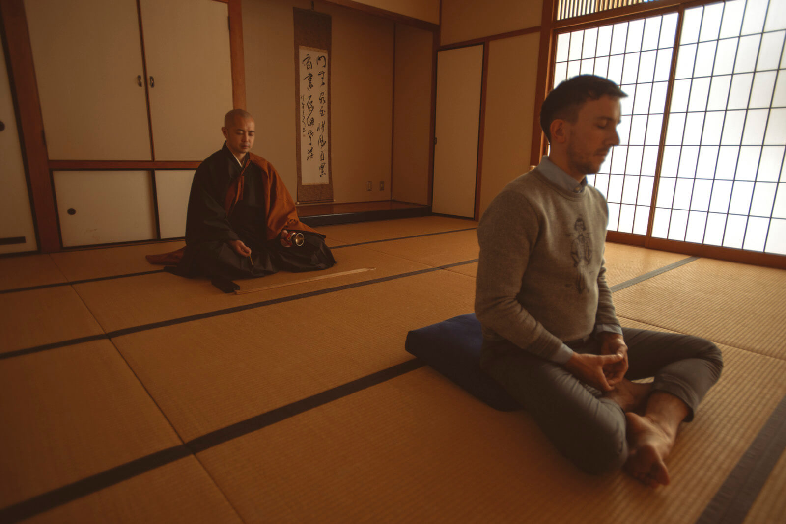 I am kneeling on the tatami floor, my hands folded together in an unaccustomed position at the level of my lower abdomen, forming a leaf shape. Past and future have disappeared from my thoughts. I am only aware of the here and now and the rhythm of my breathing. Standing behind me, the priest guides me in my stationary voyage. His words sound like solemn secrets, somewhere between whispers and chanted sutras. With this zazen meditation experience, and for many other reasons as well, our visit to Mount Hiei will stay with us for some time. There is its history, of course, dating back more than 1,200 years. And there is also the unforgettable view of Lake Biwa, its feeling of tranquility and solace paired with the similar, yet more immediate and soul-penetrating aura of the temples and rich vegetation. From Mount Yoshino, following a brief stop in Kyoto—or, to be precise, Kyoto Station, an ultra-modern marvel of shining glass and grey steel designed by the architect Hiroshi Hara—we transfer to the Keihan Ishiyama-Sakamoto line, which we take as far as Sakamoto-Hieizanguchi station. As we step off the train, gone are the crowds and loud speakers. A spirit of calm and serenity reigns here. It is hard to believe that the vibrant and noisy Osaka is only about 60 kilometres away. Apart from the silence, the most striking thing when you arrive at Sakamoto is the omnipresence of nature: in one direction, the immense watery expanse of Lake Biwa, the largest in Japan, covering an area of 670 square kilometres and a circumference of 235 kilometres, and in the other the mountain, dense and unfathomable, the deepness of its colors, its air of mystery.