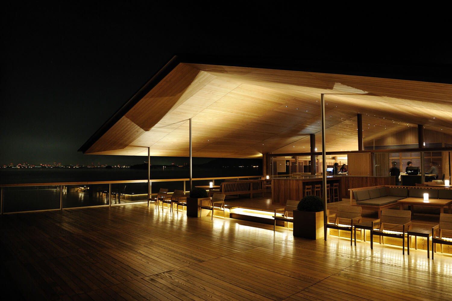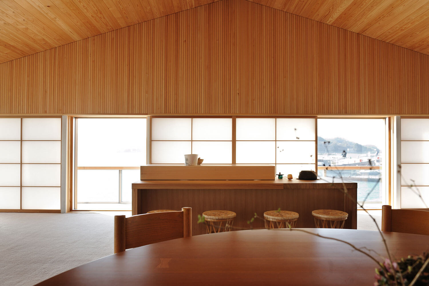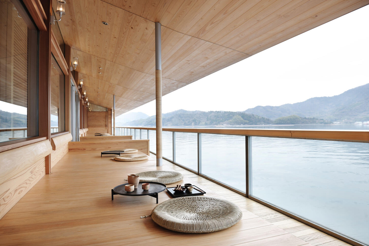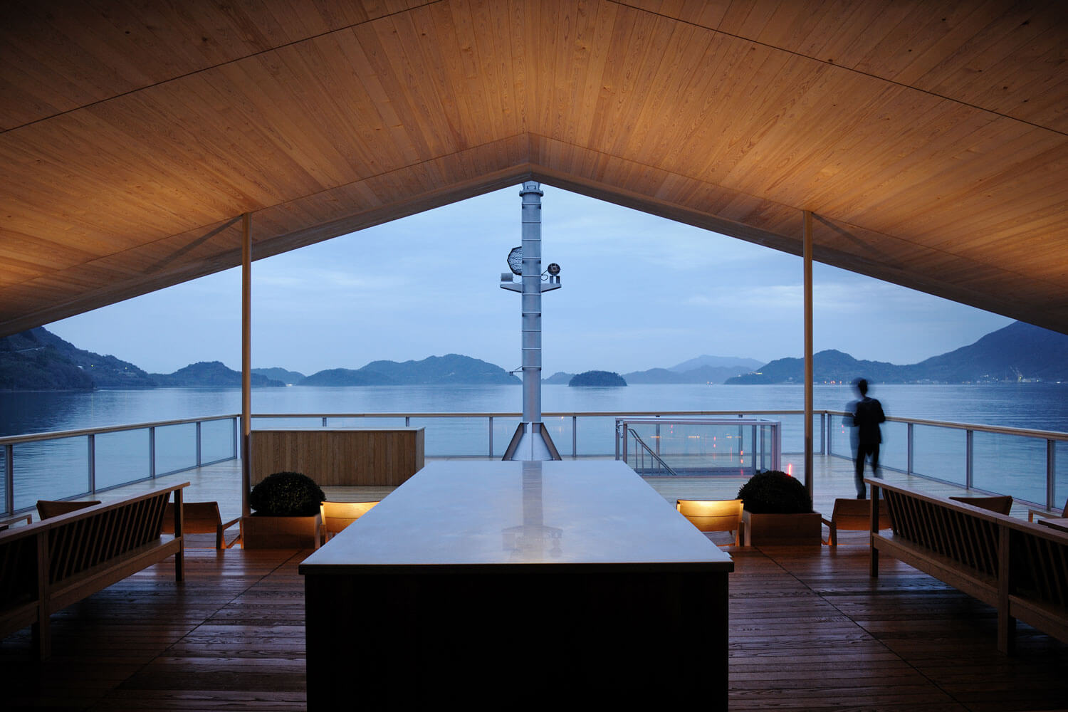 Usually the phrase ‘passenger ship’ evokes the image of giant, edifice-like ship. However, guntû is amazingly small. The appearance of guntû awaiting its departure at a pier in the Bela Vista Marina at Onomichi, its home port, does not exude the overpowering feeling of a huge passenger ship. Its gabled roof even suggests the outward appearance of a traditional Japanese house. The designer of the boat was the Japanese architect Yasushi Horibe known as a specialist in designing comfortable housing. On guntû as well, he brilliantly realised passenger rooms and spaces that somehow match the natural features and climate of the Seto Inland Sea. With only nineteen passenger rooms, the boat travels the sea specifically with that limited number of guests in mind.