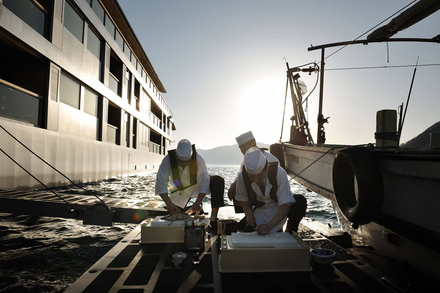 Another way to experience ineffable luxury on guntû, perhaps paradoxically, is just to do nothing at all. When guests arise each morning, they are greeted by multi-island scenery already drifting past them through the windows. Part of the scene on shore may include men working in shipbuilding yards, or fishermen dangling their fishing lines into the sea, or schoolchildren cycling to their morning lessons. The routine life of the Seto Inland Sea flows by the boat as if in a story. When seen from the extraordinary vantage point of the sea, even things as simple as everyday human behavior can become unbearably stimulating. Tasting fresh seafood through the eyes of a fisherman, as stated previously, certainly falls into that category of experiences. While fish just as fresh can be enjoyed on land as well, eating it in a fishing port or on board or ship will definitely cause one’s tongue’s sensibility and sensitivity toward the ingredients to change.