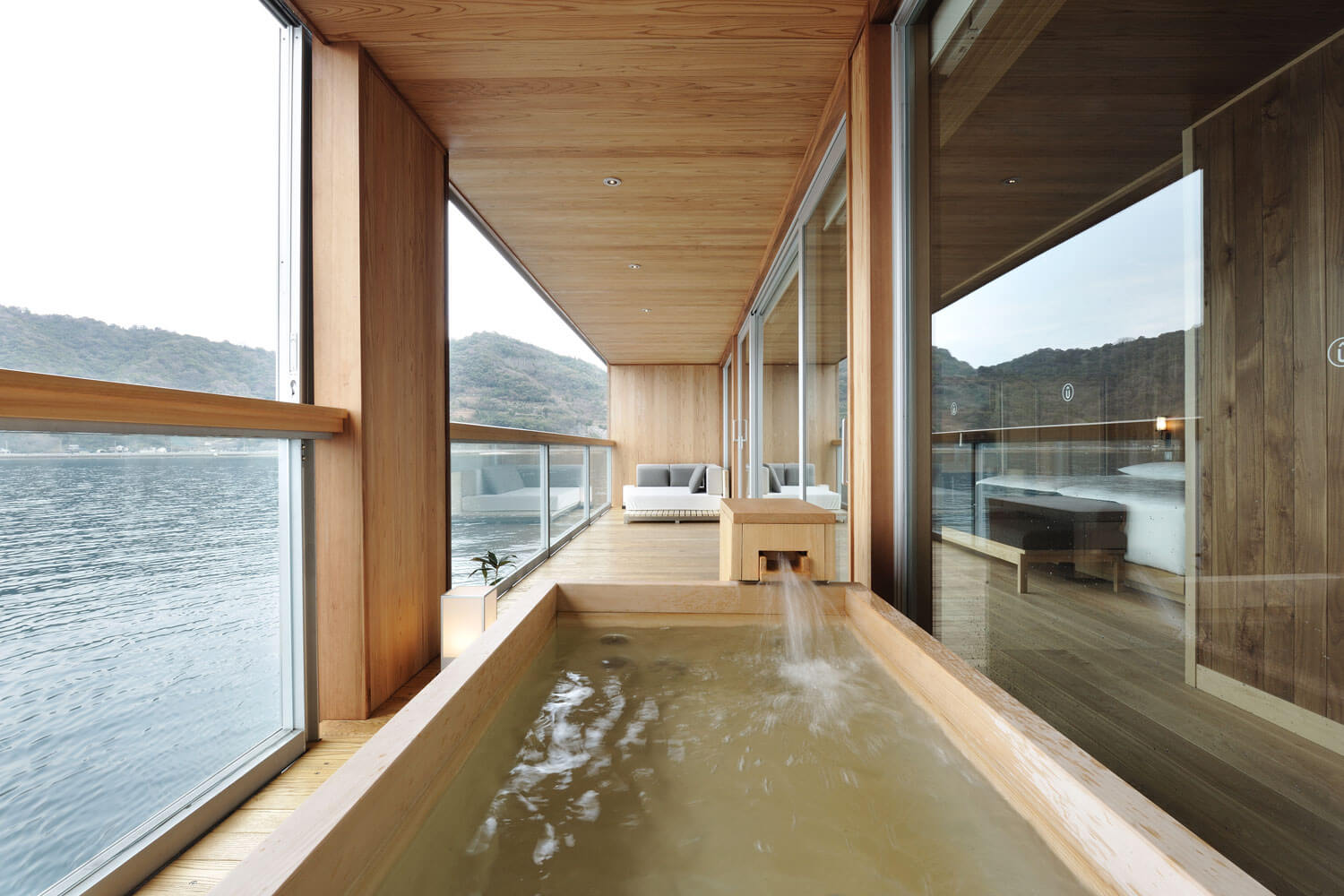 The wooden bath in the ‘Grand Suite’, made from hinoki, or Japanese cypress, is ensconced in the room’s balcony, providing guests with a view of the changing scenery as they relax contentedly.