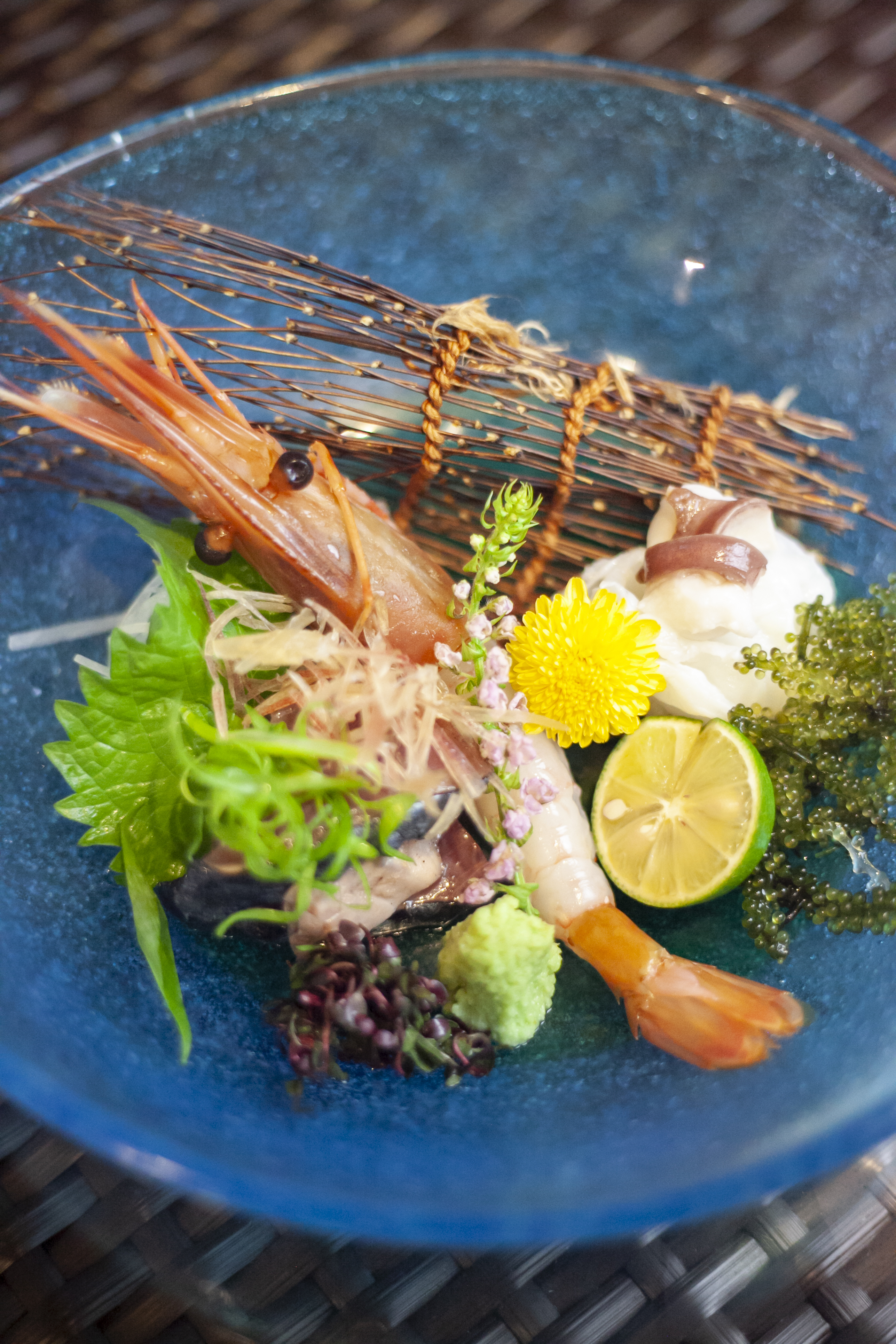 Sashimi with fish from the coastal waters. The type of fish offered changes depending on the season.