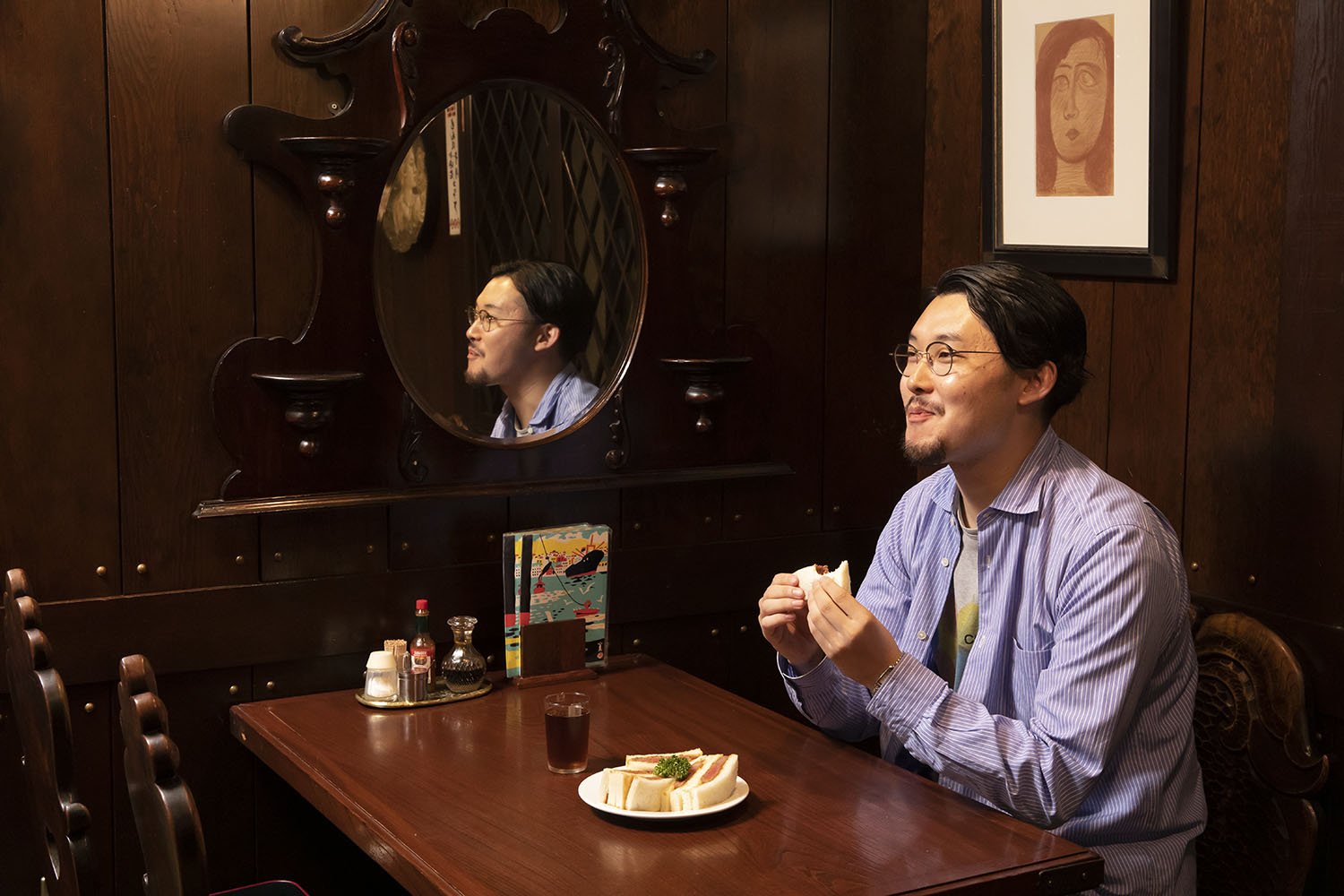 Mon was established in 1936. It features traditional flavors, like the beef cutlet sandwich in the photo, on its menu. Imported furnishings and furniture used since its founding evoke a sense of history.