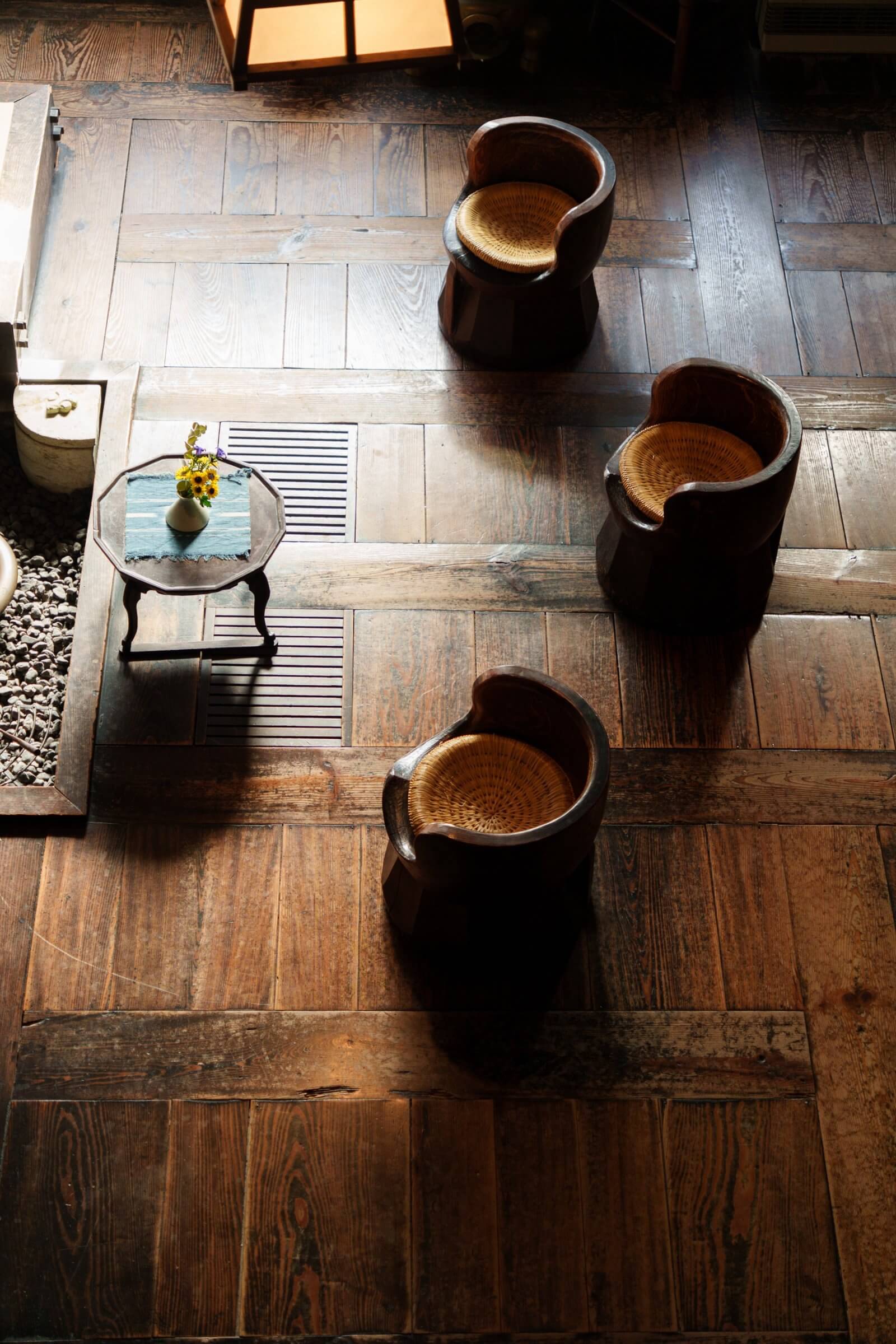 Their presence differs entirely from Western aesthetics that reshape nature, such as marble interiors or finely bent wood chairs.