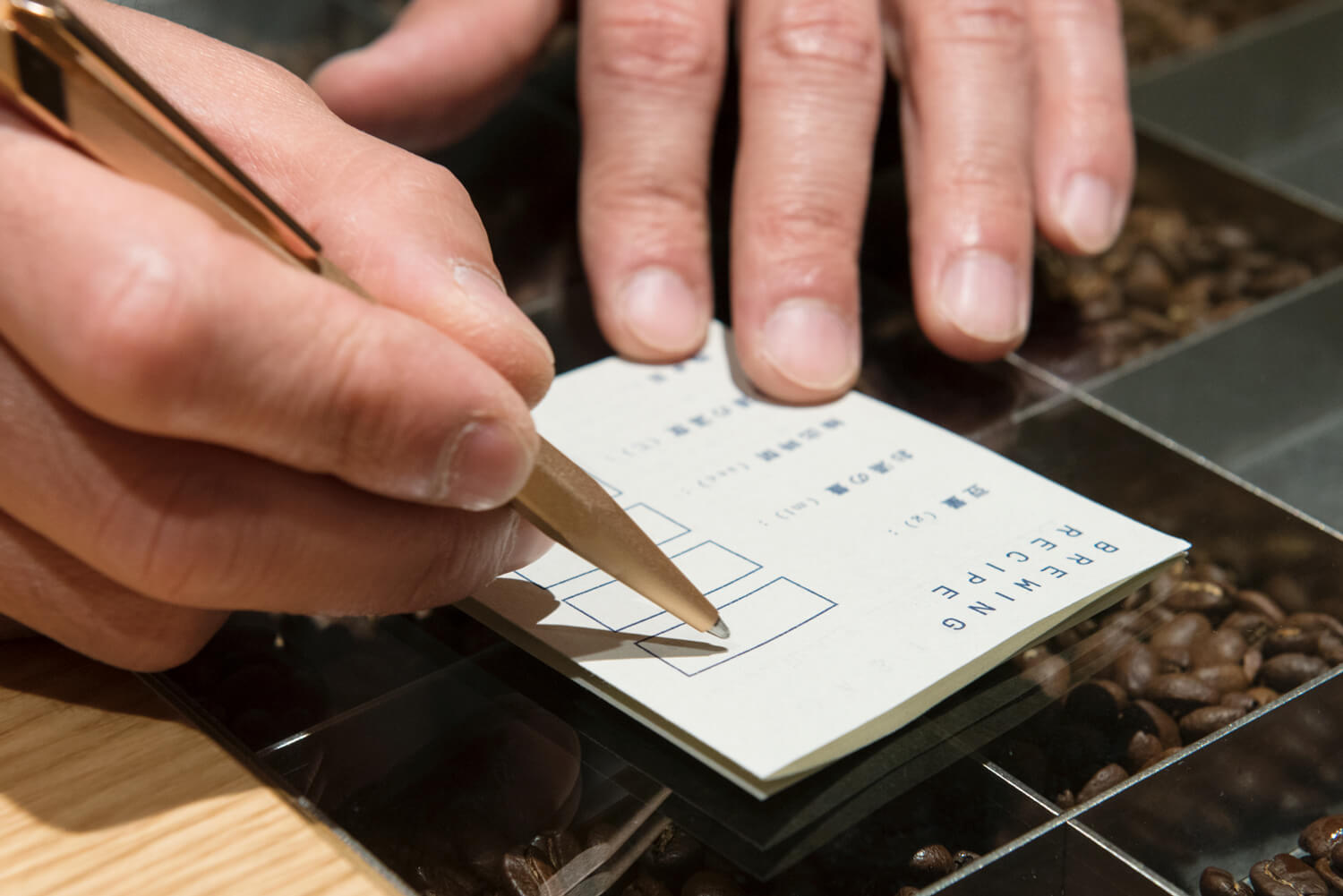 Koffee Mameya offers an incomparable experience that celebrates coffee. Here, the baristas, dressed in white shirts, are generous in their advice and introduce customers to coffee. They take close note of customers’ tastes and preferences and then use these to offer them the coffee that best corresponds to what they’re looking for. Once the coffee has been selected, the baristas carefully hand the customers a packet. The packet contains the coffee beans and a card that details their recommendations concerning the right brewing equipment and the ideal extraction time, because nothing is left to chance. ‘In Japan, customers often queue up to buy beans from famous roasters, but get home and, because of a few small errors, don’t like the coffee. That’s a real shame, so our baristas act as the middle point between roaster and customer’, Kunitomo explains.
