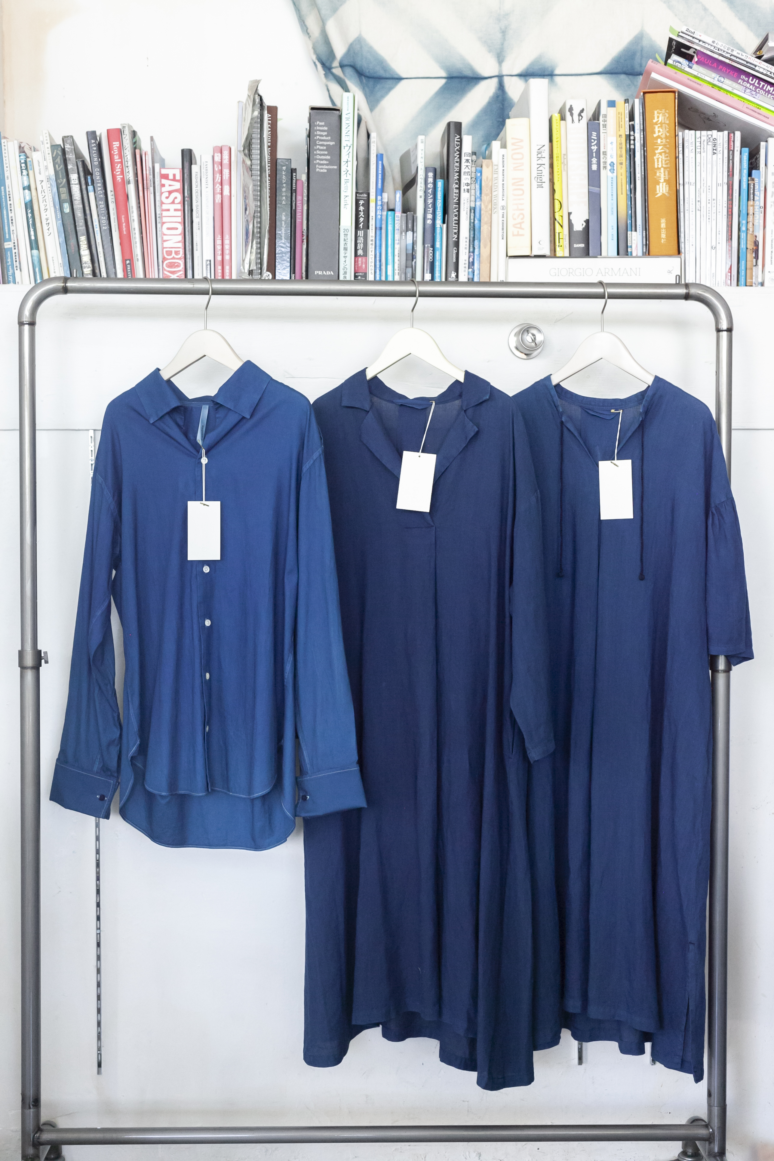 Products dyed with Ryukyu indigo. The two on the right are women's dresses, and the one on the left is a men's dress shirt.