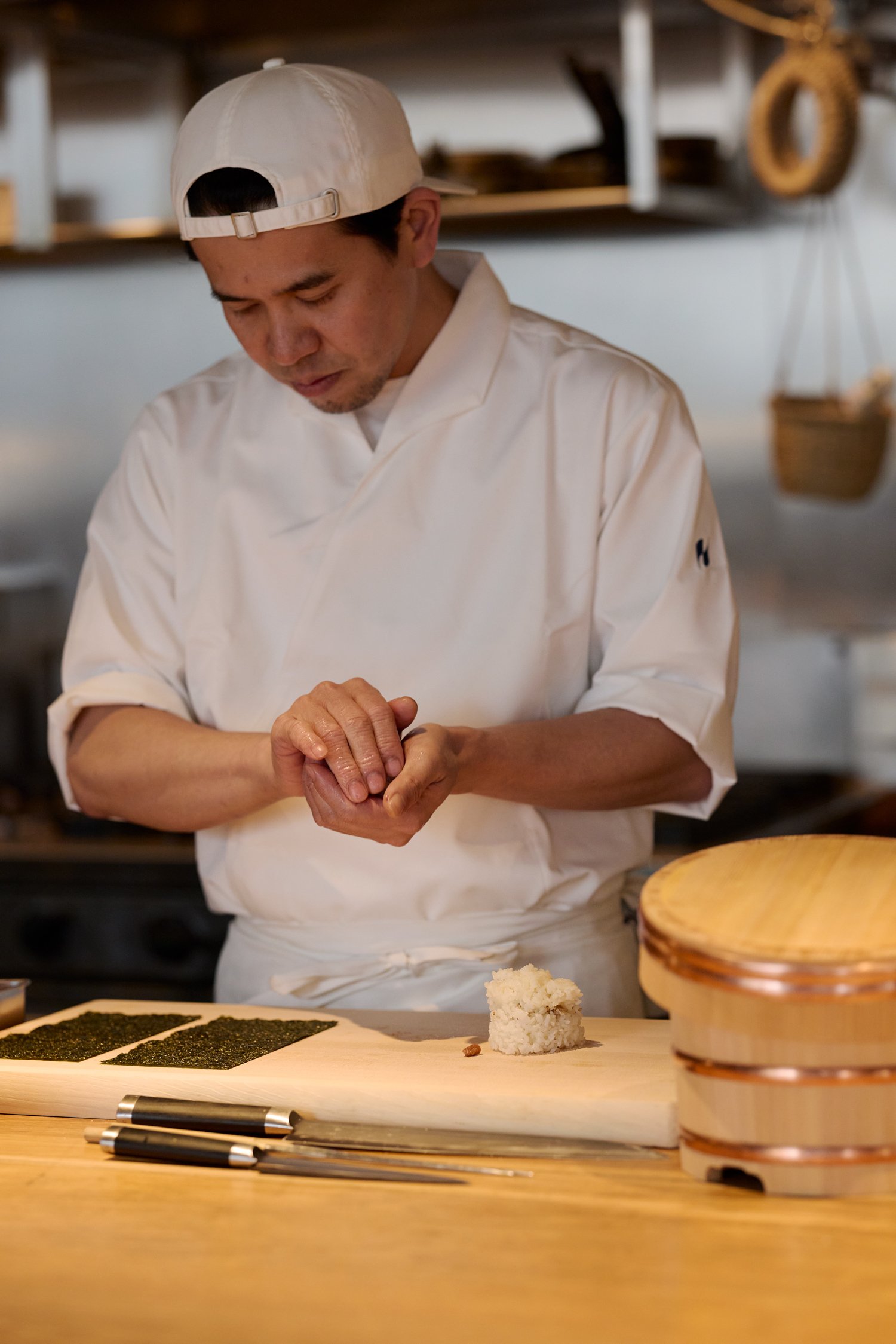 Chef Tomohiro Maruyama hand-shapes each rice ball with precision and care.