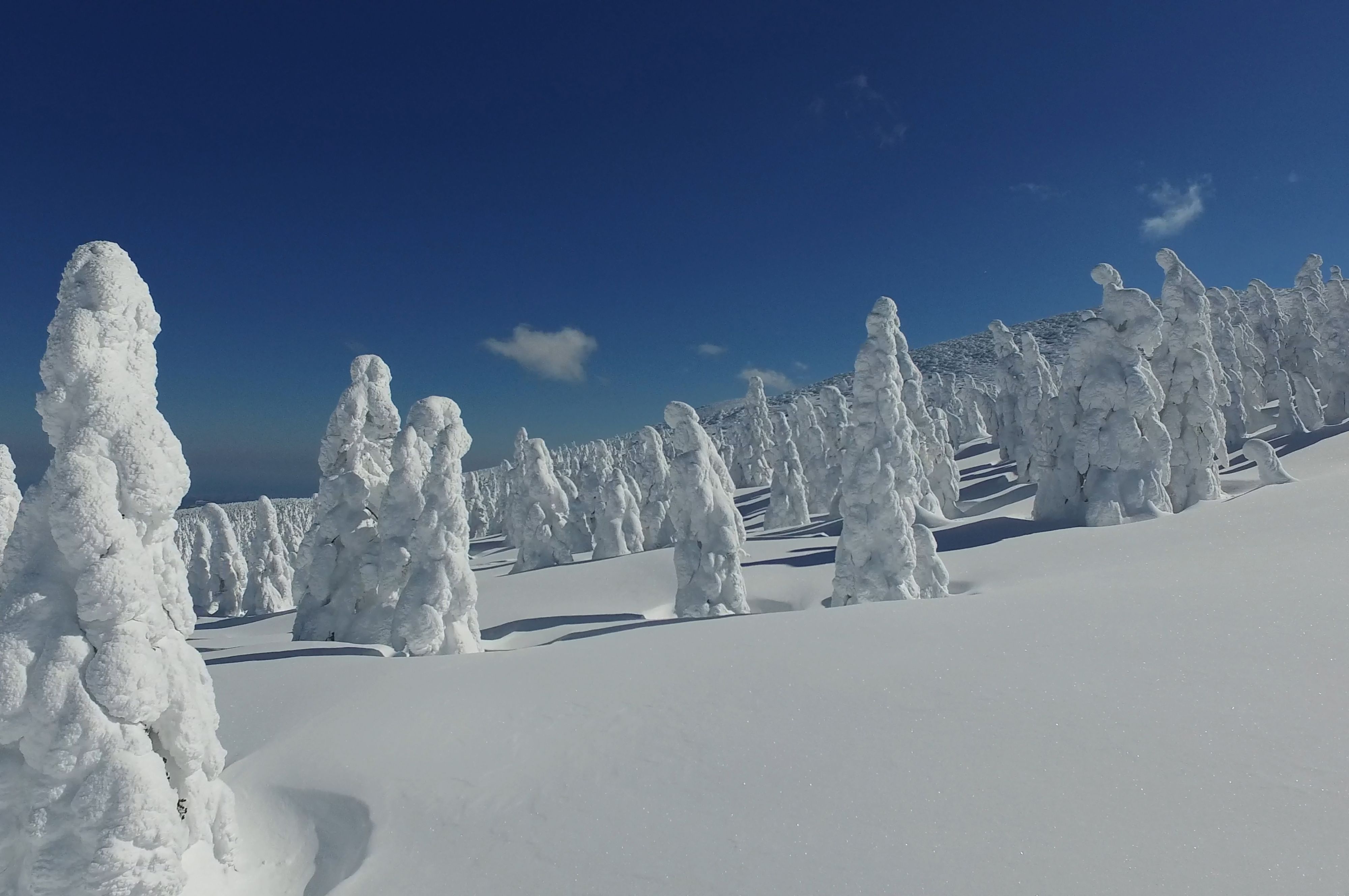 From mid-December until early March, the Aomori fir trees, a variety of conifer found in subalpine zones, are covered in ice blown by the wind as days go by, which in turn is gradually covered with snow, enveloping the trees in a thick white cloak. This gives rise to silhouettes with unusual profiles, known as juhyo, which translates as ‘monsters’, and which enjoy their peak period in February, when their shape is at its roundest.
