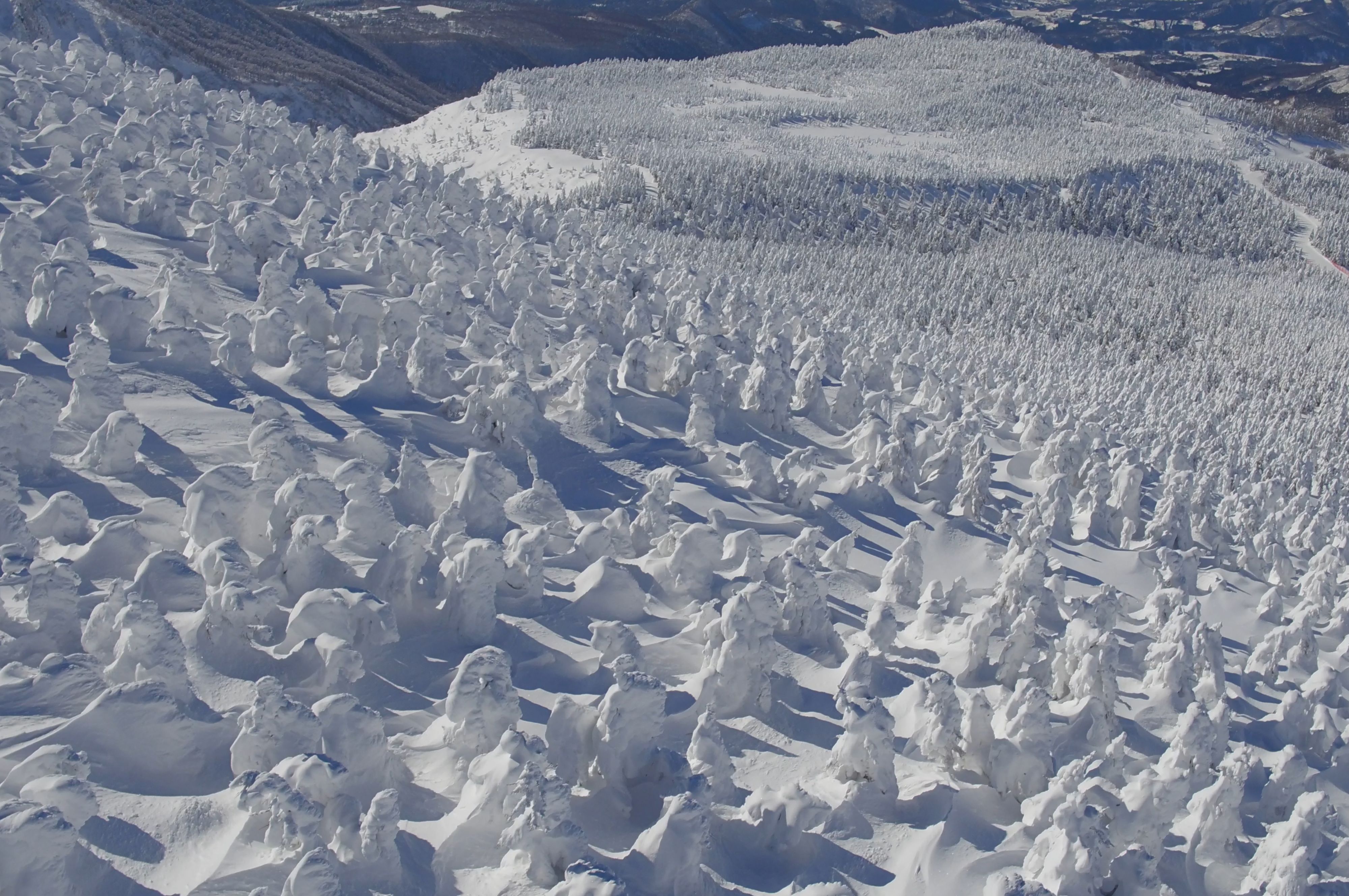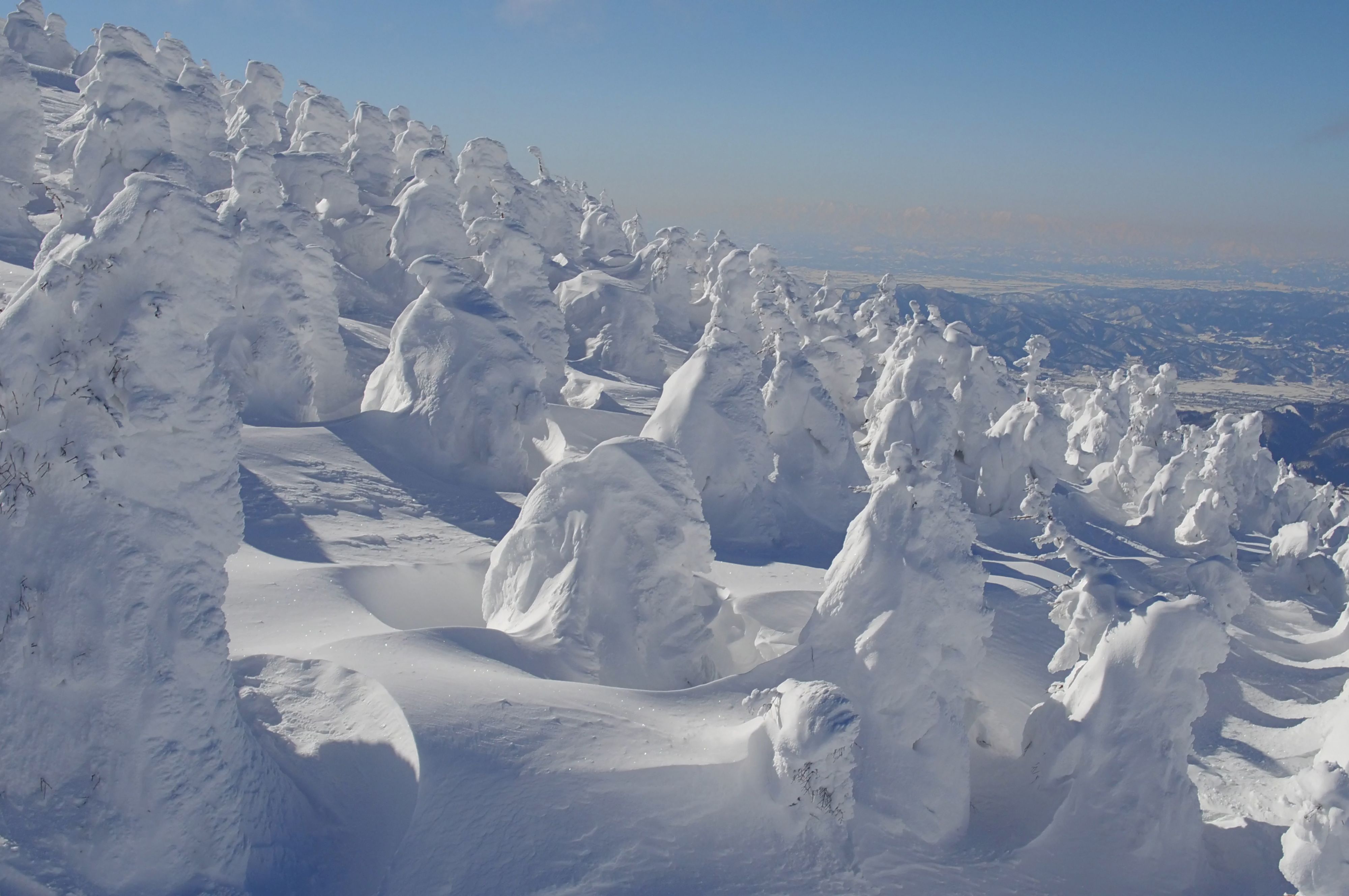 On the border between Yamagata and Miyagi prefectures in northern Honshu stands Mount Zao, at an altitude of 1841 metres. Though it is mainly known for its caldera, within which lies a lake that changes colour with the seasons, Mount Zao also owes its fame to the peculiar forms that stand on its slopes when winter comes.