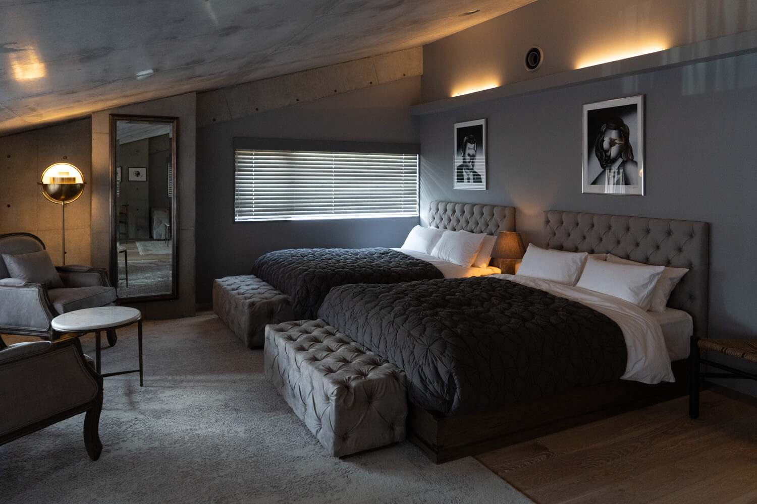 The art is enhanced by the raw architecture, designed by architect Seiichiro Takeuchi. ‘We knew that we were going to install modern works of art, so I wanted the architecture to be minimalist and raw so that everything would hang together perfectly’, explains the former partner of Japanese master Tadao Ando’s firm. Node Hotel is characterised by the omnipresence of smooth concrete, a material very dear to the latter. ‘It’s a kind of homage to him, as well as to the sophisticated techniques used in the Japanese construction industry. This technique with concrete is used by Japanese woodworkers, who are declining in number as years go by. It will be very precious in the future’, the architect explains.