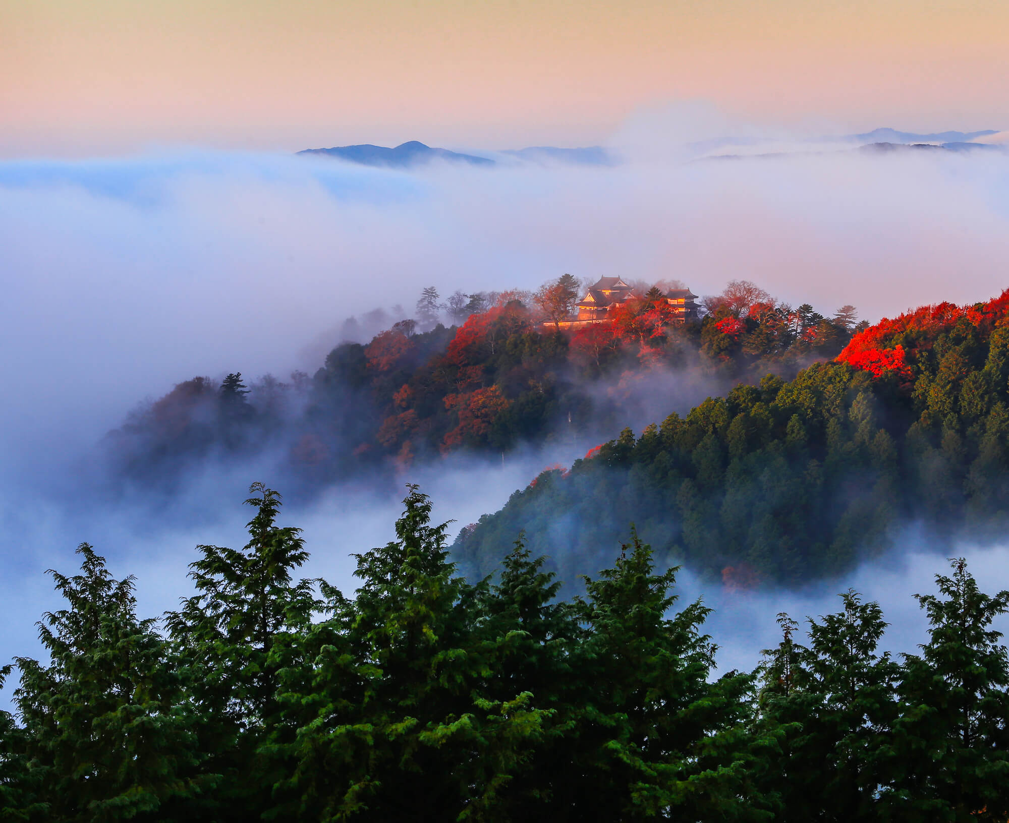 Bitchu-Matsuyama Castle, emerging from a sea of clouds in the early hours of the day.
