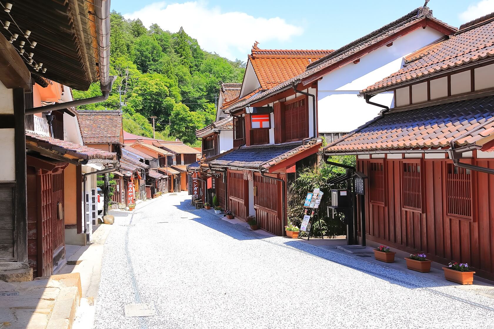 The main street of Fukiya, with its ‘bengara’ red-painted houses, is a unique sight in Japan.