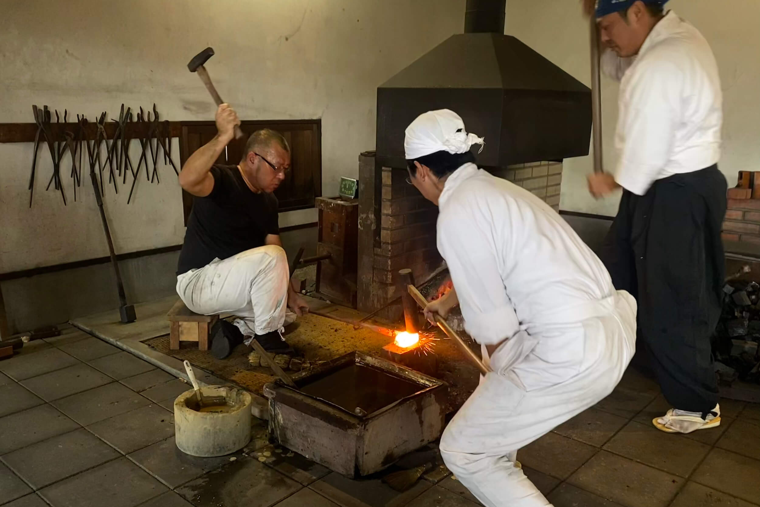 Swordsmith Hiroyasu Ando showing the process of making a sword at Bizen Osafune Japanese Sword Museum.