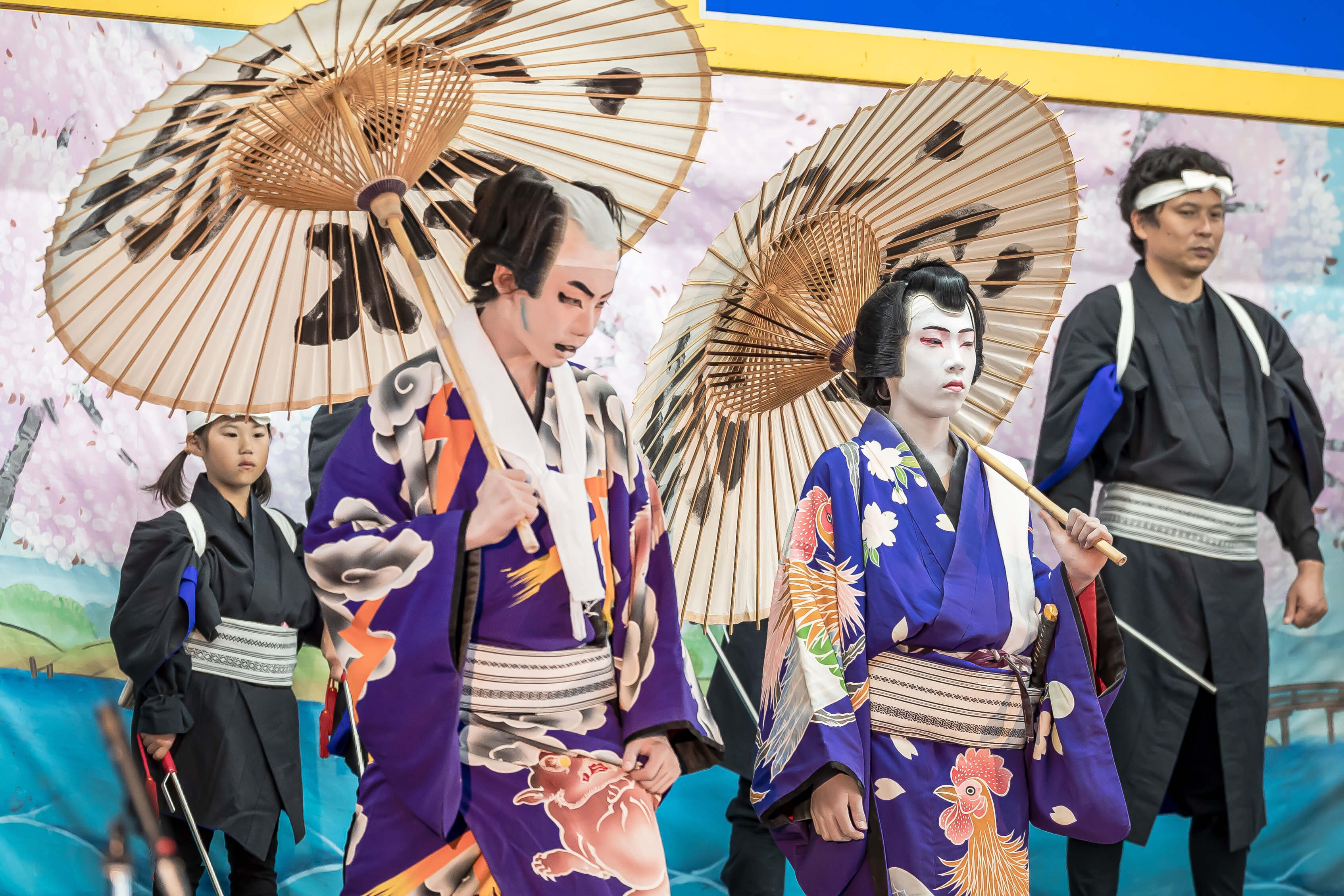 Actors of Kabuki Yokozen, in the traditional costumes and make-up of the genre, in which every detail is full of meaning.