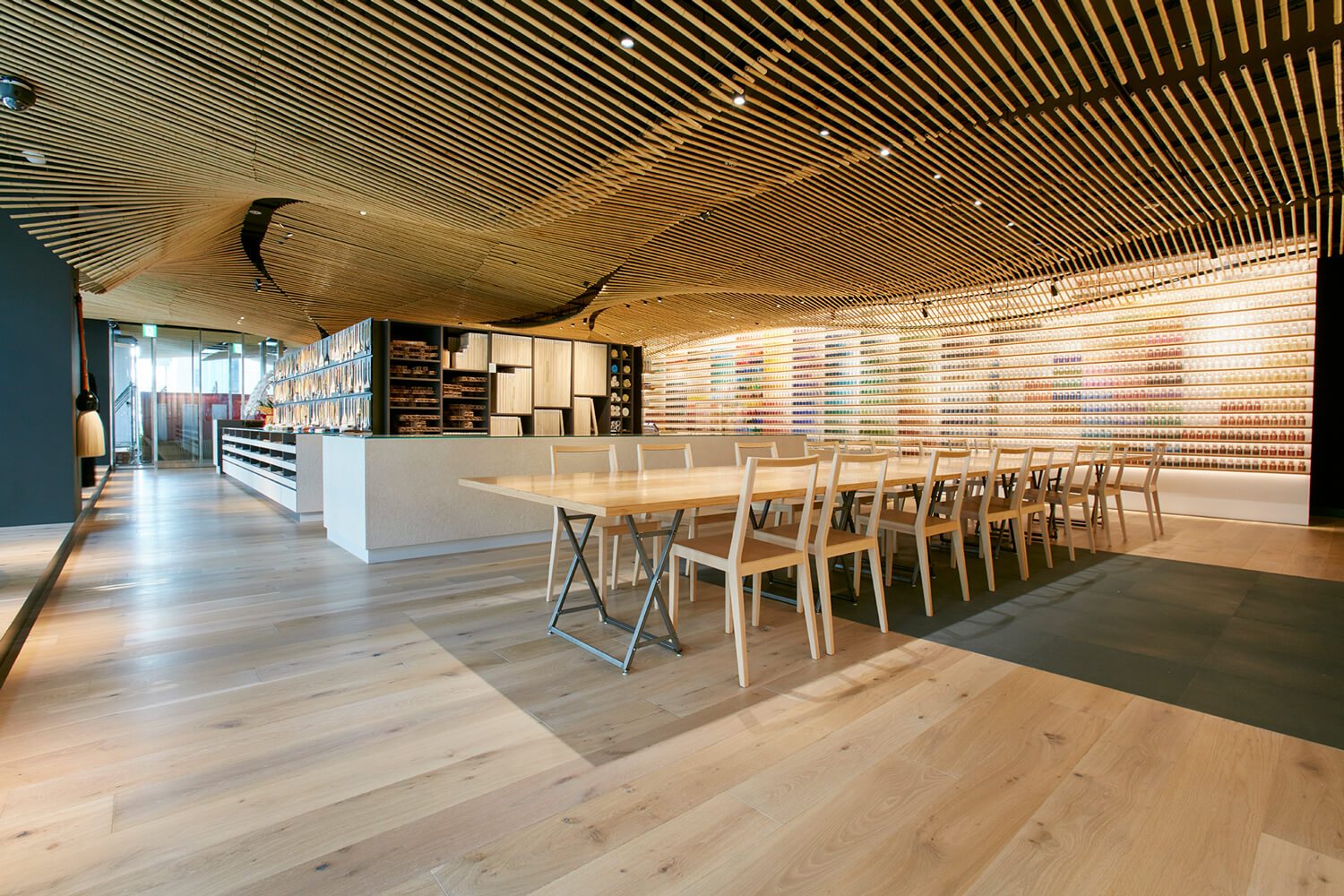 The entire interior of the building, designed by Kengo Kuma, was designed based on organic materials. PIGMENT is housed beneath an undulating ceiling covered with bamboo boards that subtly echo brushstrokes.
