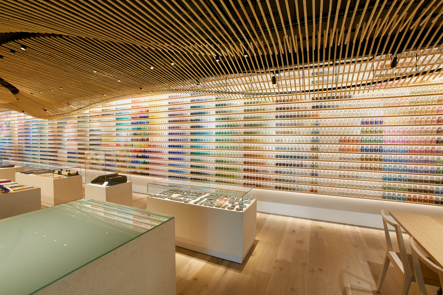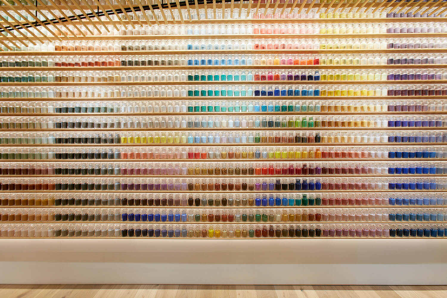 In this store designed by Kengo Kuma, visitors come not only to stock up on materials, but also to admire the coloured pigments on the wall.