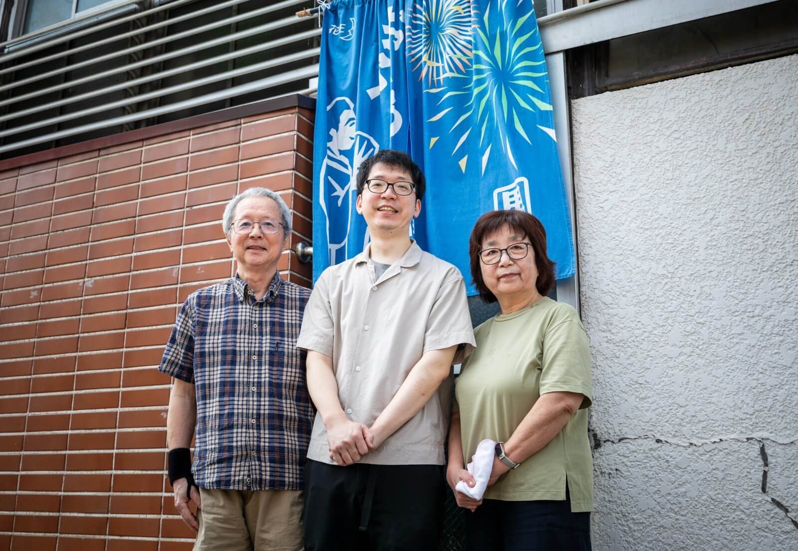 From left: third-generation owner Shirō Takatsuchi; fourth-generation successor Junmei; and Shirō’s wife, Keiko. With Junmei joining the family business, improvements to the facilities have begun from a fresh perspective. Together, the family works hand in hand to protect and sustain the ‘sento’.
