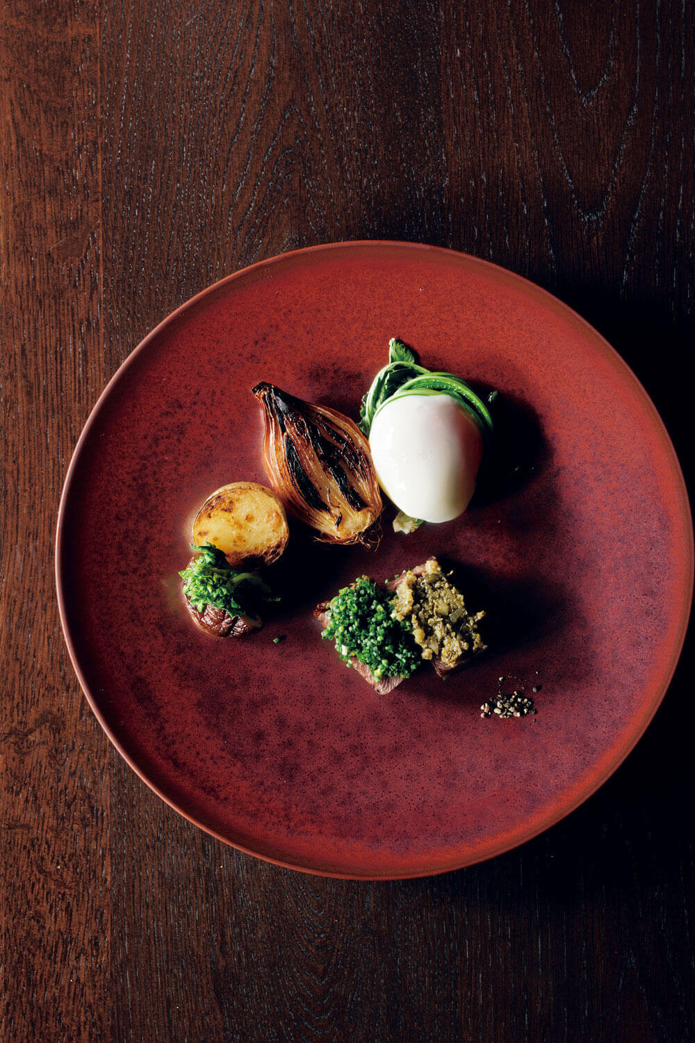 Steak from Tajima cows, for which Hyogo Prefecture has become well known, is cooked alongside locally sourced vegetables and eggs.